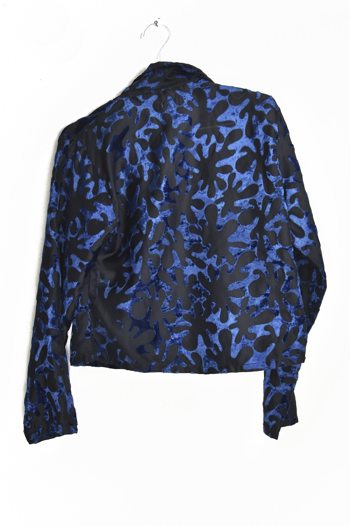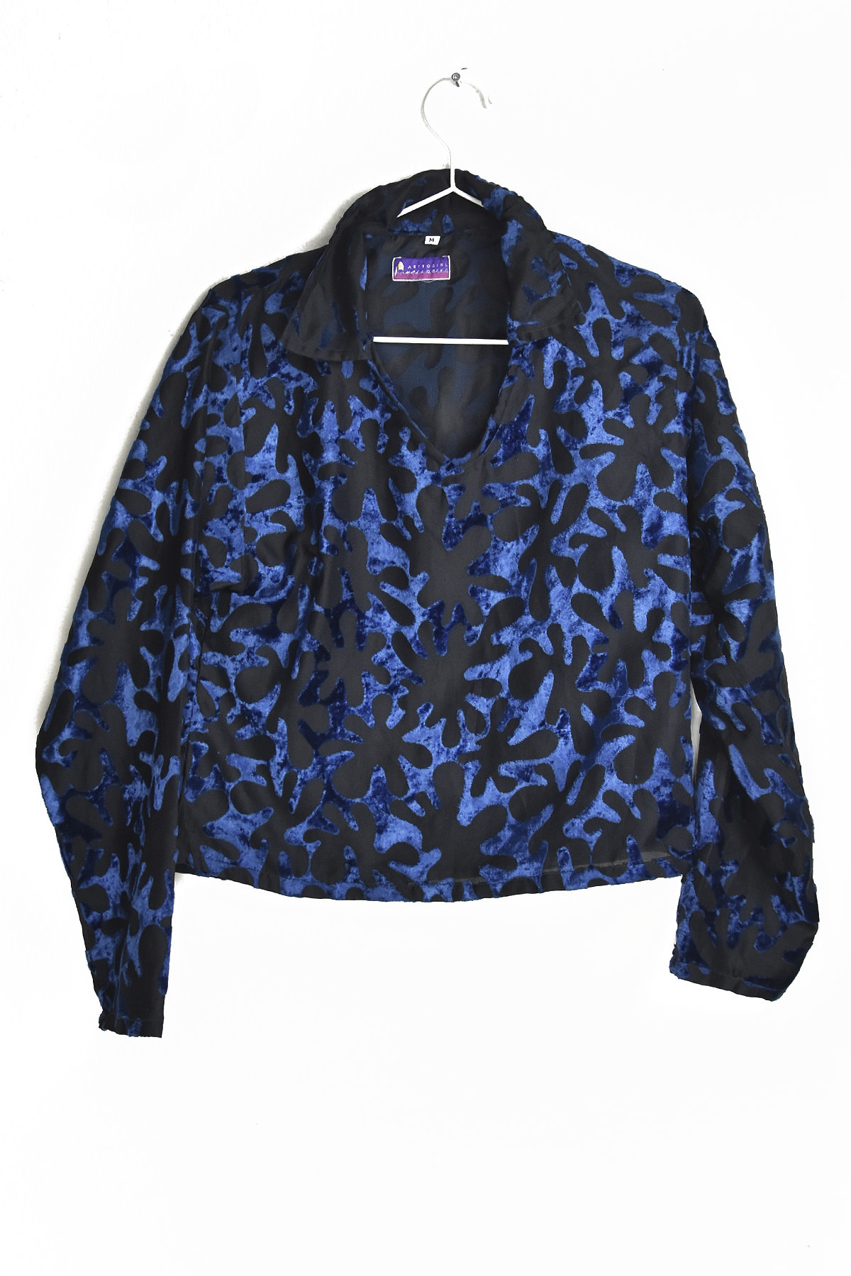 Embrace the groovy vibes with this eye-catching 70’s blouse. Its bold black and blue geometric shapes create a striking visual impact, transporting you back to the era of disco and bell bottoms. The lightweight fabric ensures comfort, while the unique design sets you apart from the crowd. Perfect for adding a touch of retro flair to your wardrobe, this blouse is a must-have for fashion-forward individuals who appreciate vintage style.