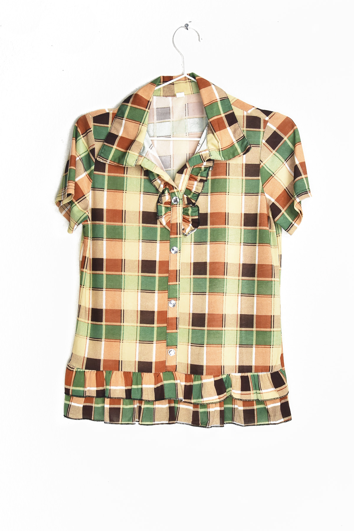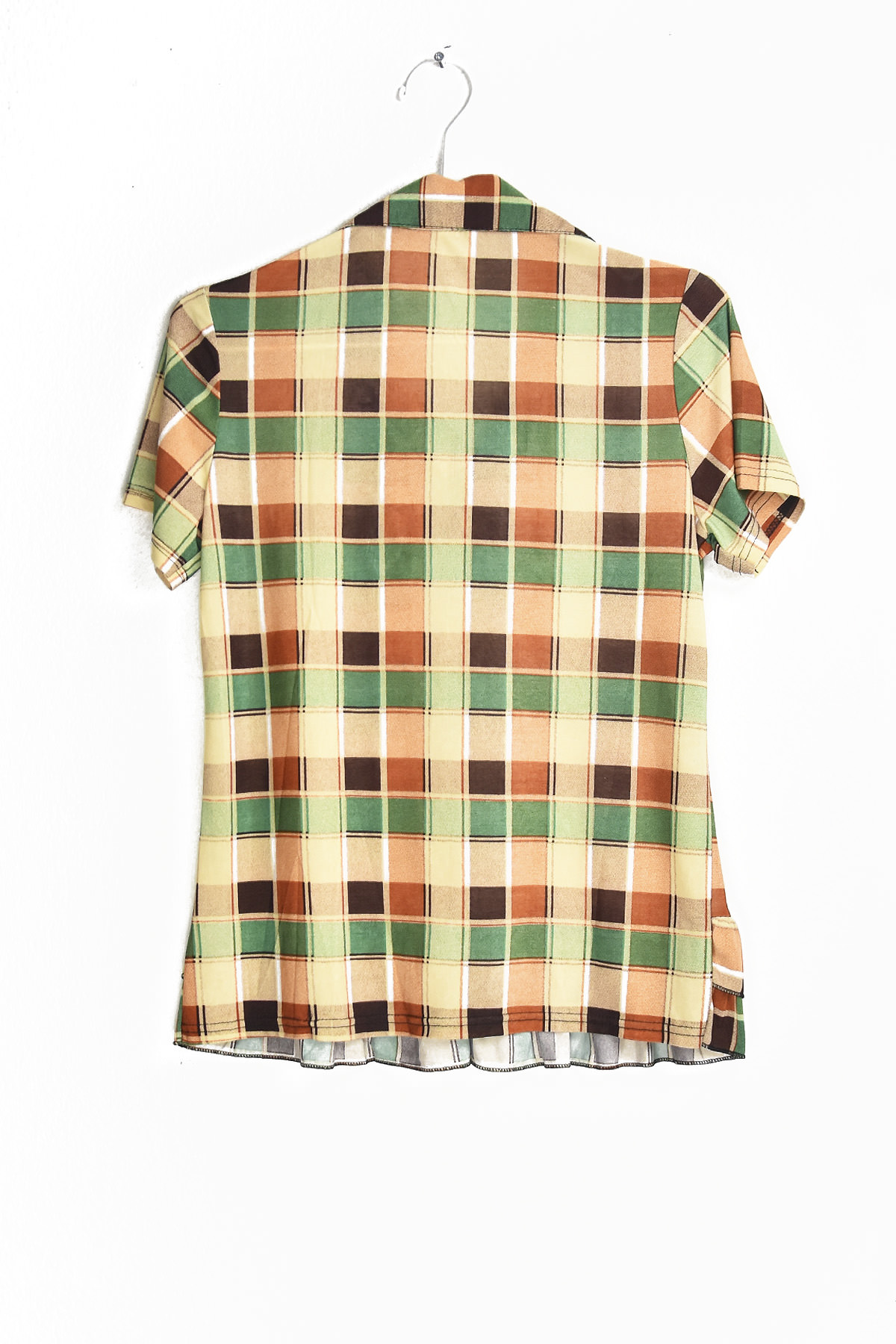 Embrace the groovy vibes with this retro-chic 70’s blouse. Its captivating brown, red, and green checkered design evokes nostalgia and adds a touch of bohemian flair to your wardrobe. The lightweight fabric ensures comfort, while the flattering silhouette accentuates your figure. Stand out from the crowd with this unique and eye-catching piece that embodies the spirit of the 70s.