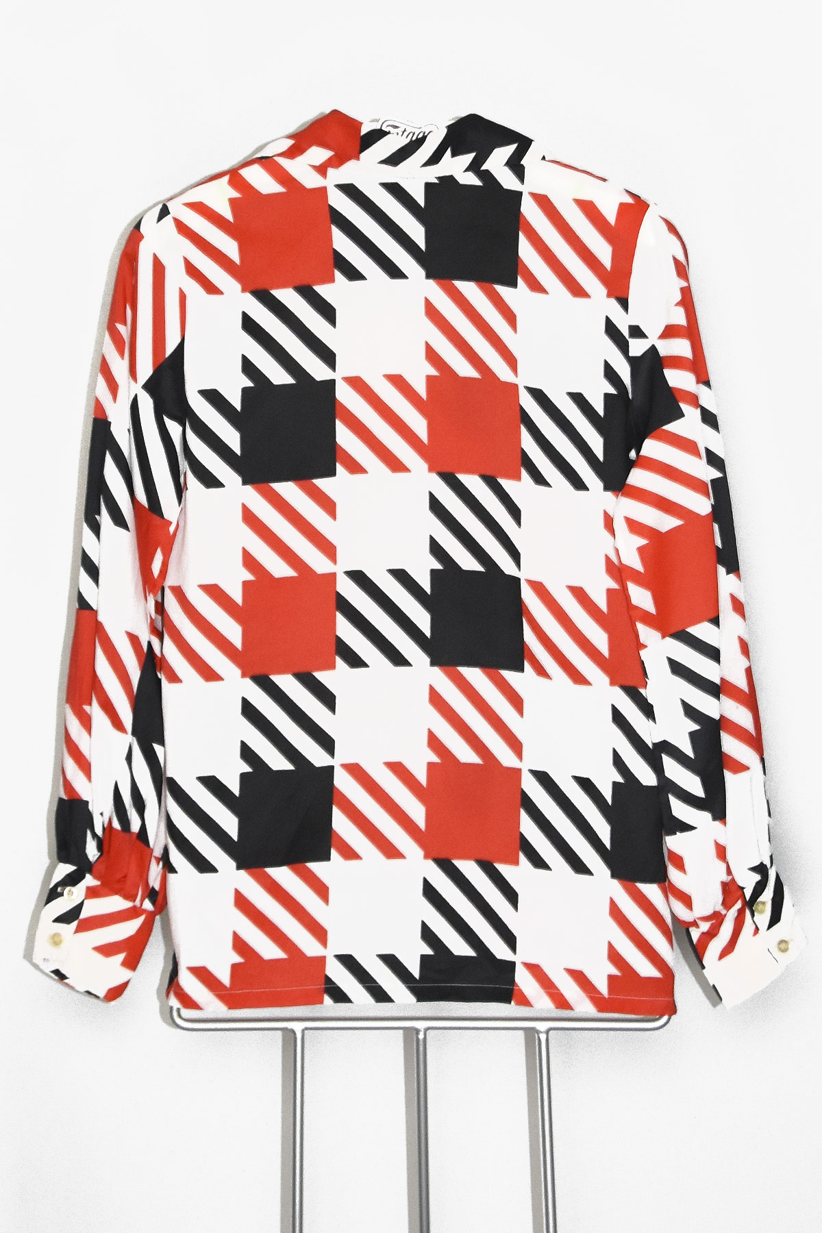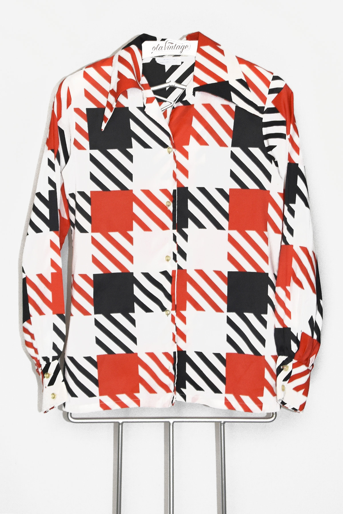 Embrace the groovy vibes with this eye-catching 70’s blouse. Its bold red and black geometric print, featuring box and line shapes, exudes retro charm. The lightweight fabric ensures comfort, while the unique design adds a touch of individuality to your wardrobe. Perfect for making a statement at any occasion.