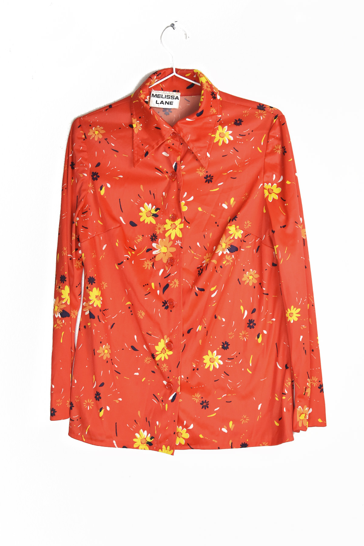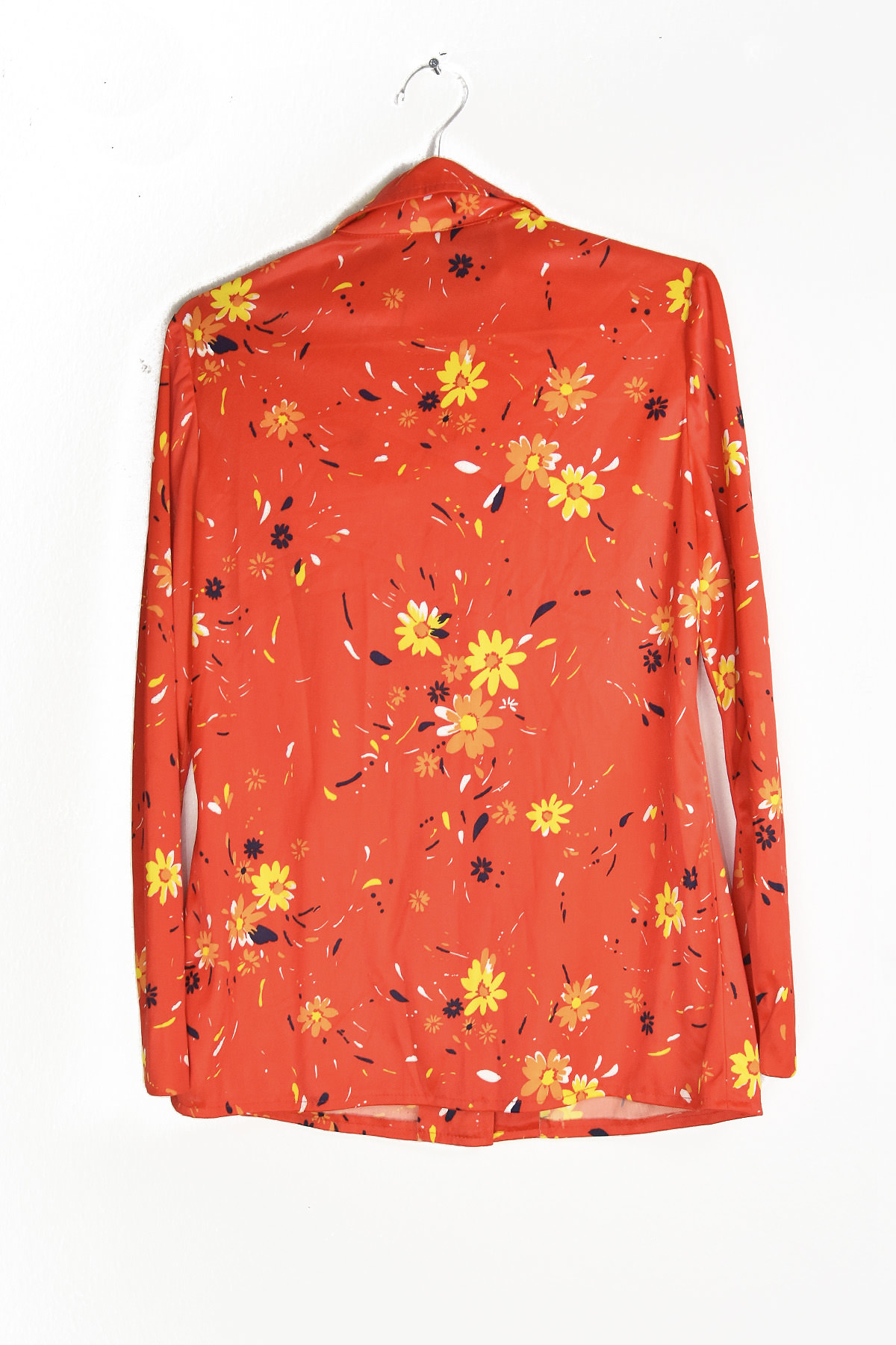 Embrace the groovy vibes with this vibrant 70’s blouse. Its eye-catching red base is adorned with cheerful yellow flowers, evoking a sense of nostalgia and summery charm. The small size ensures a flattering fit, while the lightweight fabric offers comfort and breathability. Perfect for adding a touch of retro flair to your wardrobe, this blouse is a must-have for any fashion-forward individual.