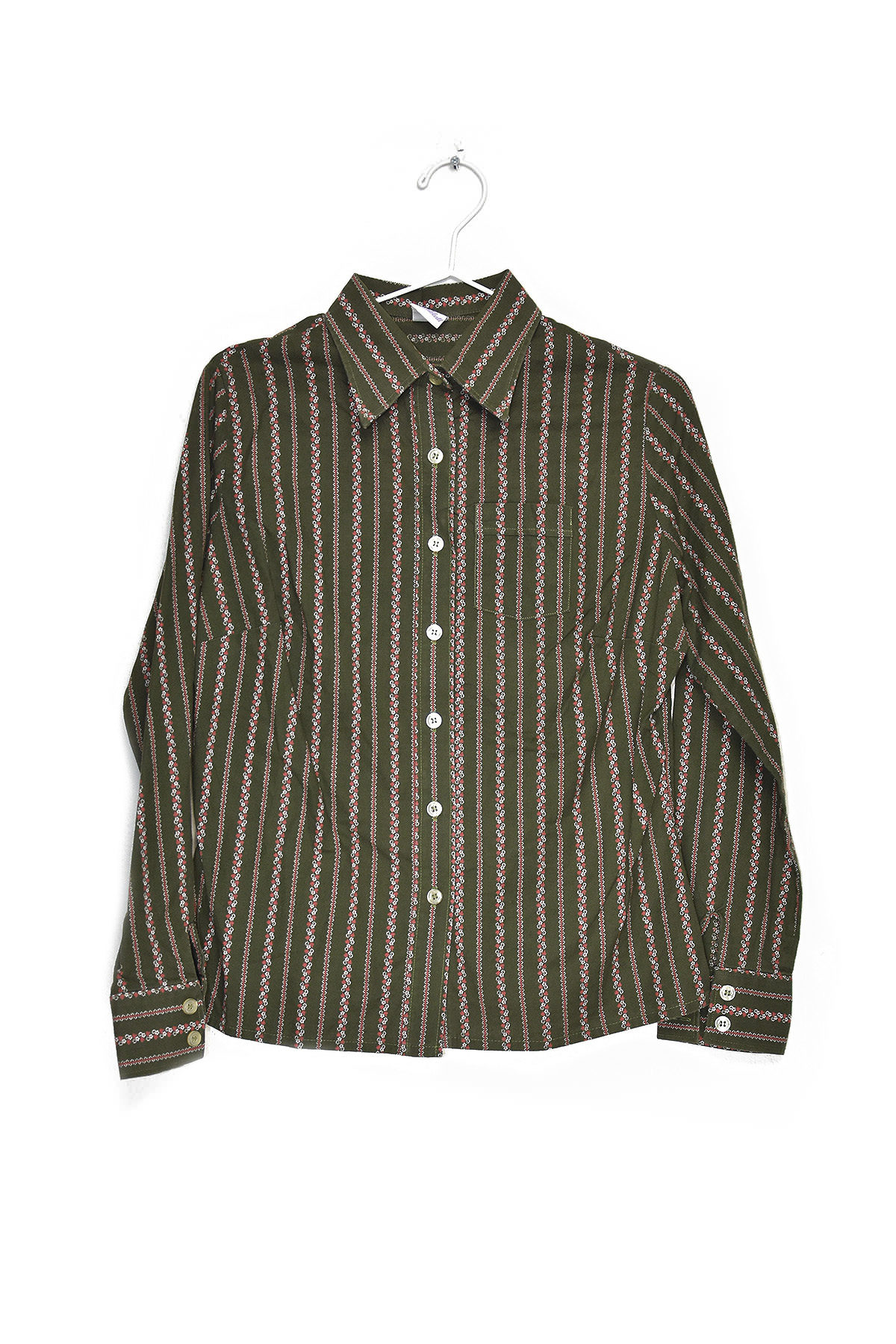 Embrace the groovy vibes with our 70’s-inspired blouse. Its striking vertical olive grey lines create a flattering silhouette, while the lightweight fabric ensures all-day comfort. Perfect for adding a touch of retro chic to your wardrobe, this blouse is a must-have for fashion-forward individuals.