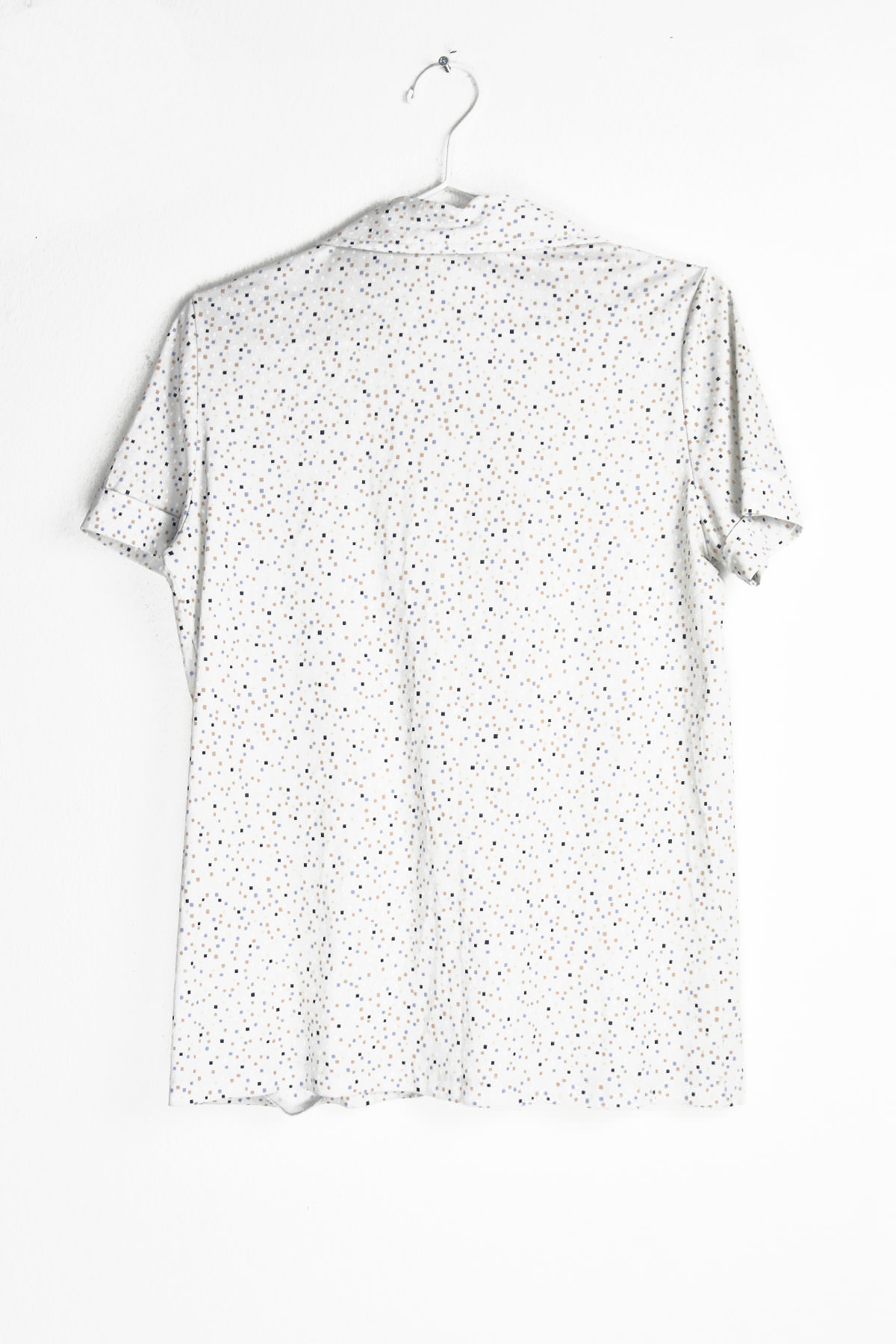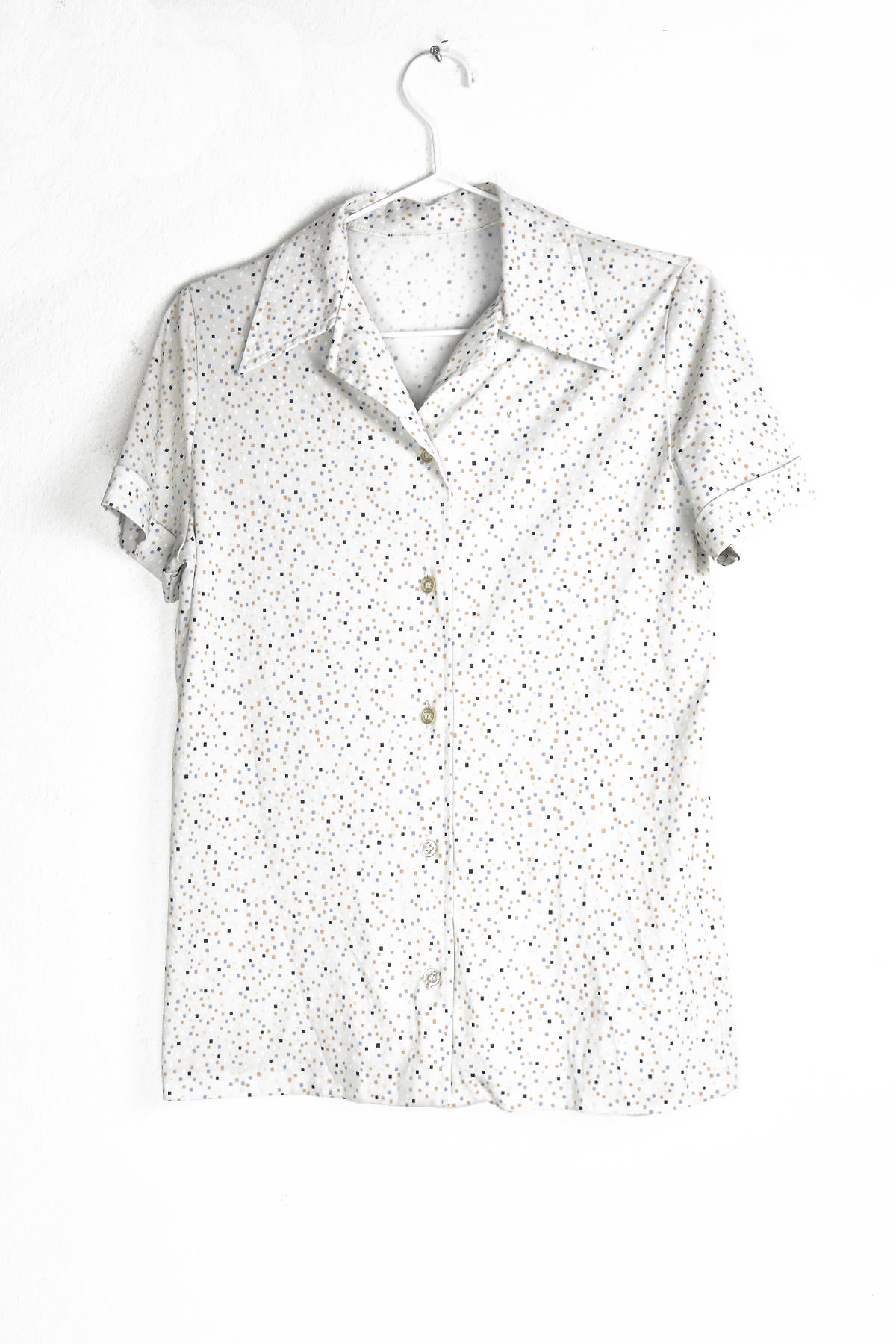 Embrace the groovy vibes with this retro-inspired 70’s blouse. Its eye-catching mini print featuring black and brown squares on a crisp white background exudes a timeless charm. The lightweight fabric ensures comfort, while the flattering silhouette accentuates your figure. Perfect for adding a touch of vintage flair to any outfit, this blouse is a must-have for fashion-forward individuals seeking a unique and stylish statement piece.