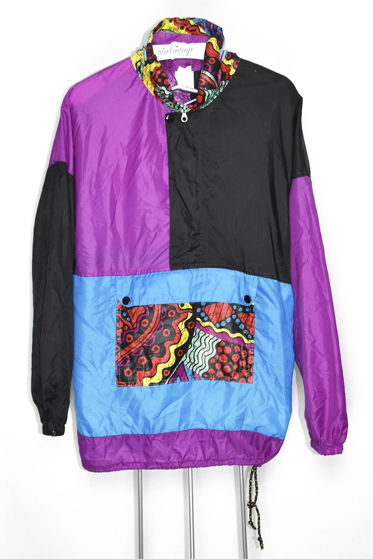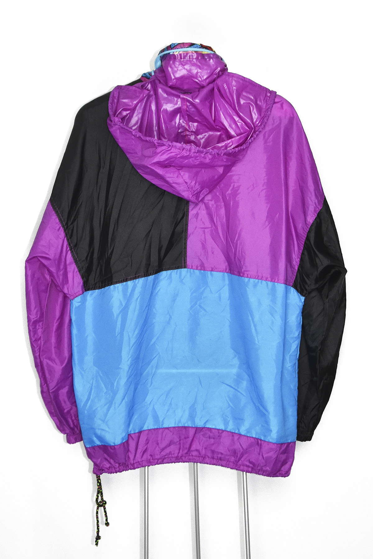 Relive the vibrant 80s with this eye-catching rain jacket! Its bold purple and blue retro design will turn heads, while its waterproof and breathable fabric keeps you dry and comfortable. The adjustable hood and cuffs provide a customizable fit, ensuring protection from the elements. Stand out from the crowd with this unique and stylish jacket that combines nostalgia with functionality.