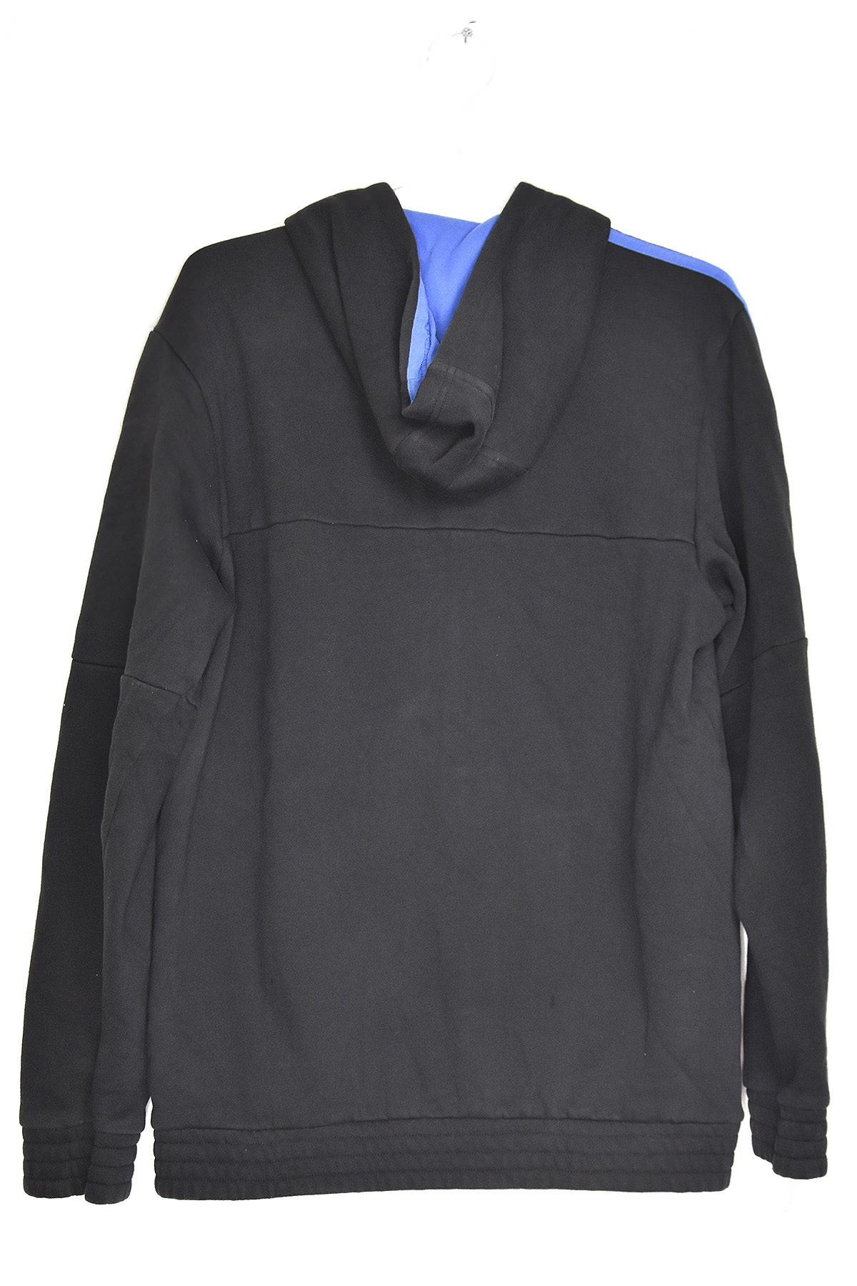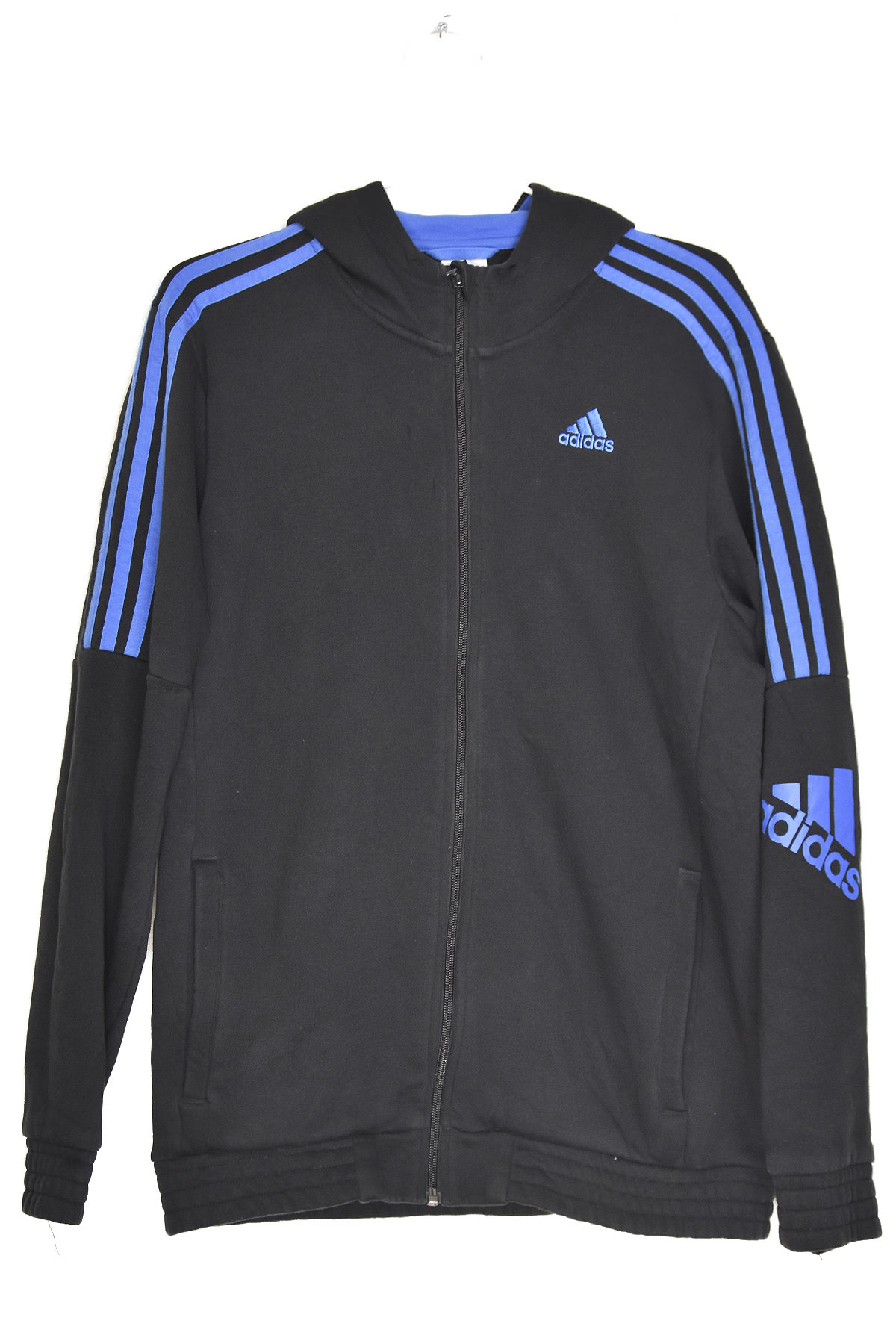 Stay warm and stylish with the Adidas blue stripes black hooded sweatshirt. Crafted from soft and durable cotton, this sweatshirt features iconic blue stripes on the sleeves and a cozy hood for added warmth. Its regular fit and ribbed cuffs and hem provide a comfortable and secure fit. Perfect for casual wear or athletic activities, this sweatshirt is a versatile addition to any wardrobe.