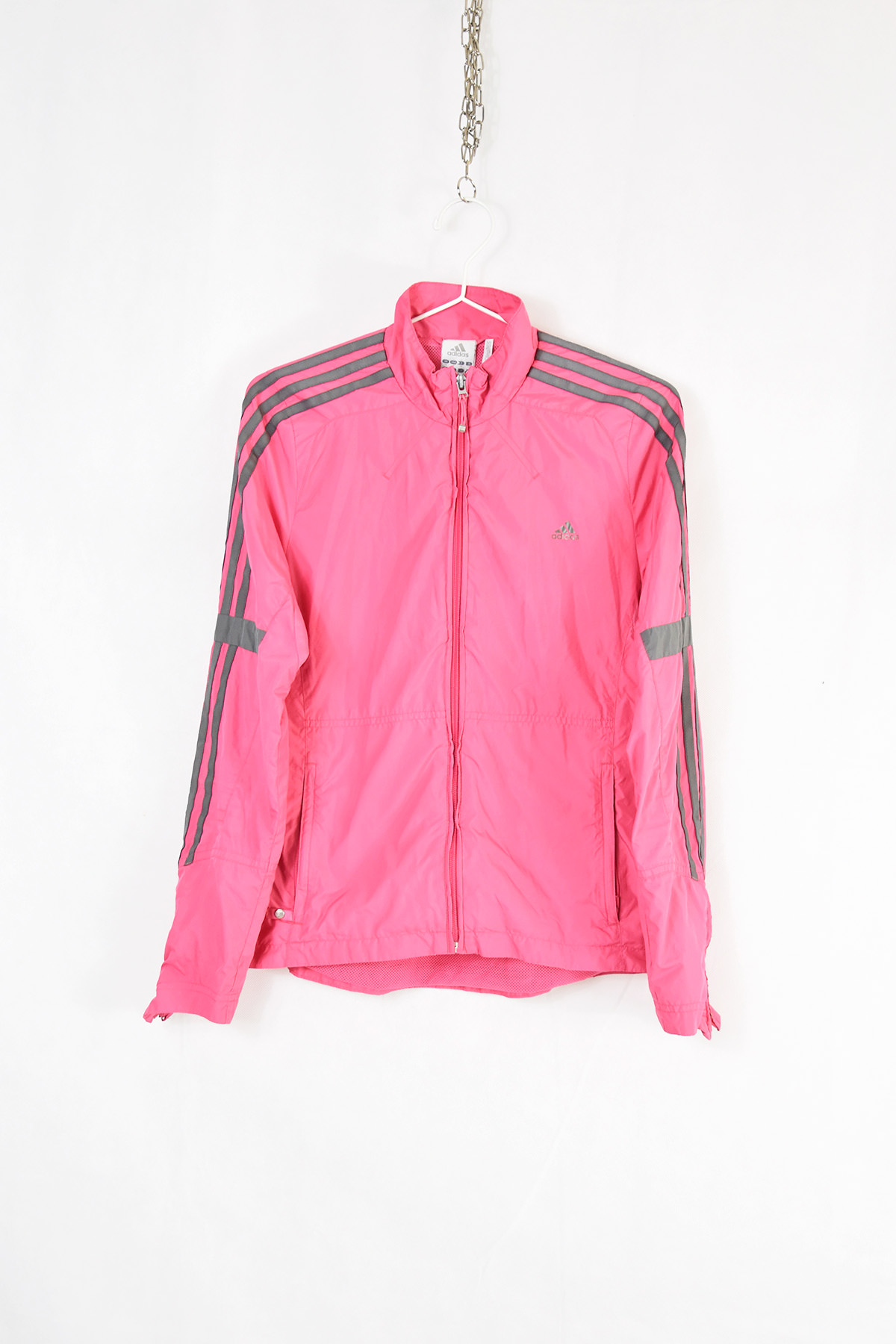 Elevate your athletic style with the Adidas pink and grey sport jacket in size S. Crafted from breathable and moisture-wicking fabric, this jacket keeps you cool and comfortable during intense workouts. Its sleek design features a vibrant pink and grey color scheme, making it a standout piece. The full-zip closure and adjustable hood provide customizable coverage, while the side pockets offer convenient storage for essentials. Whether you’re hitting the gym or running errands, this jacket combines functionality and fashion seamlessly.