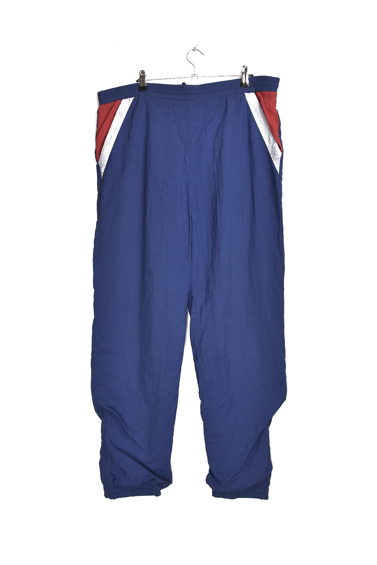 Blue track pants with red and white stripes. Size M. Features include: