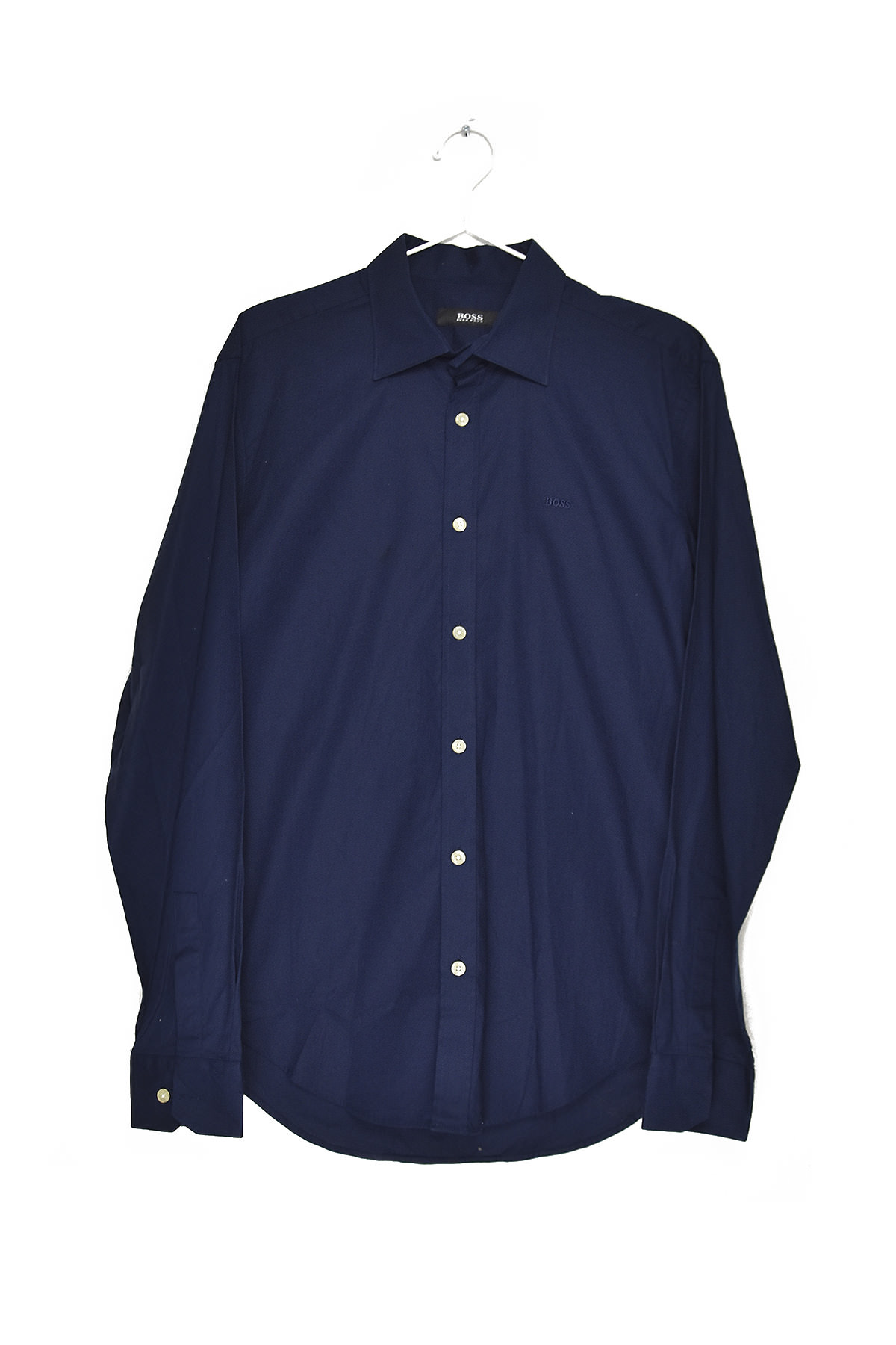 Elevate your style with the Boss navy blue shirt in size L. Crafted from premium cotton, this shirt offers exceptional comfort and breathability. Its tailored fit accentuates your silhouette, while the classic navy hue exudes sophistication. The button-down collar and single chest pocket add a touch of timeless elegance. Perfect for both formal and casual occasions, this Boss shirt is a versatile addition to any wardrobe.