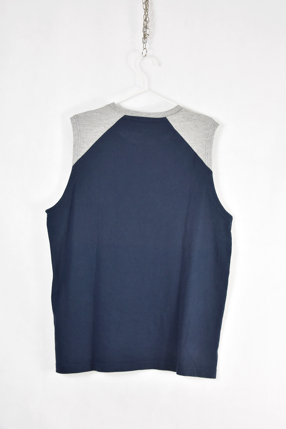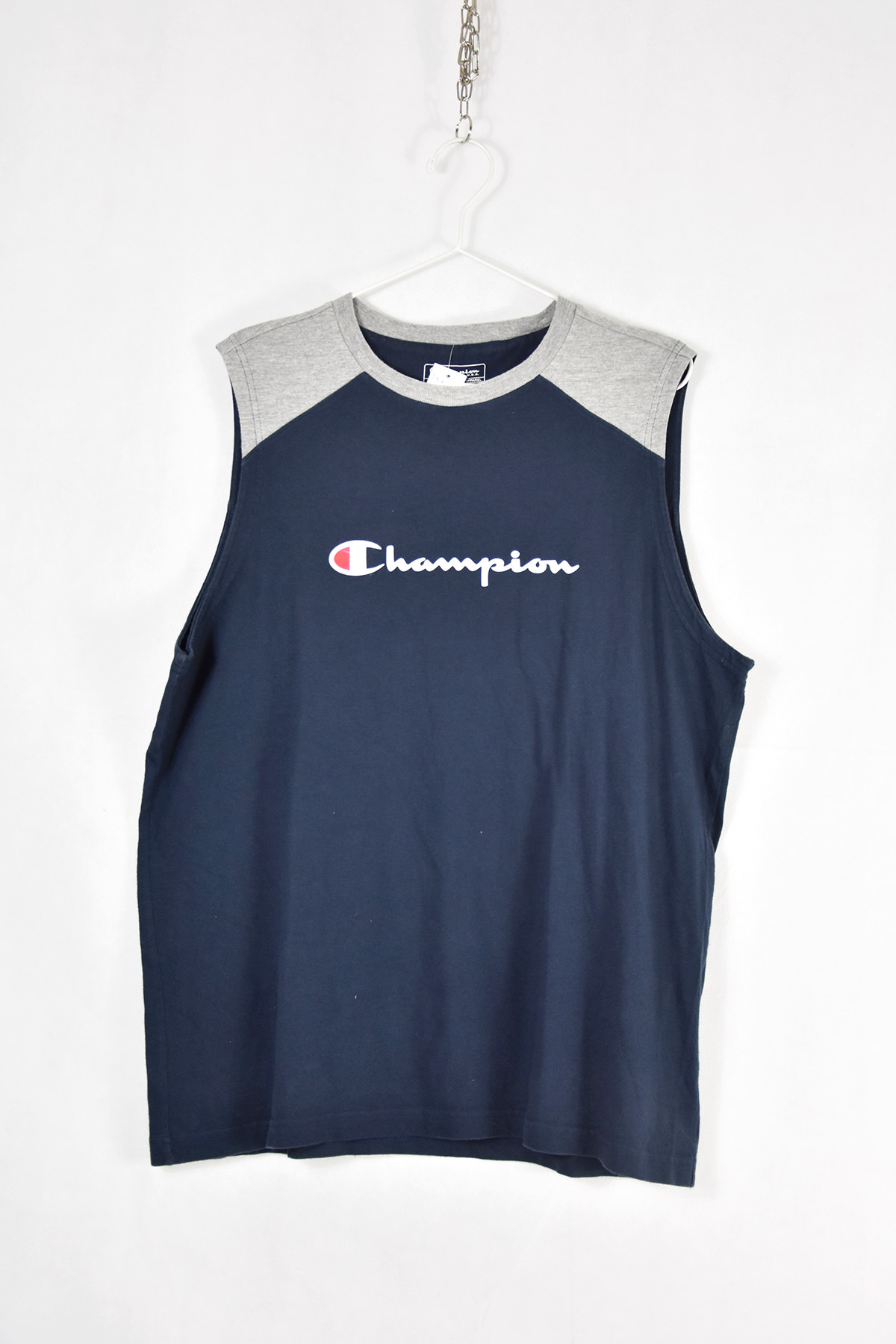 Champion blue and grey tank top in XL size, crafted from premium cotton for exceptional comfort and breathability. Its classic design features a ribbed neckline and armholes for a secure and flattering fit. The bold Champion logo on the chest adds a touch of athletic style, making it perfect for both workouts and casual wear.