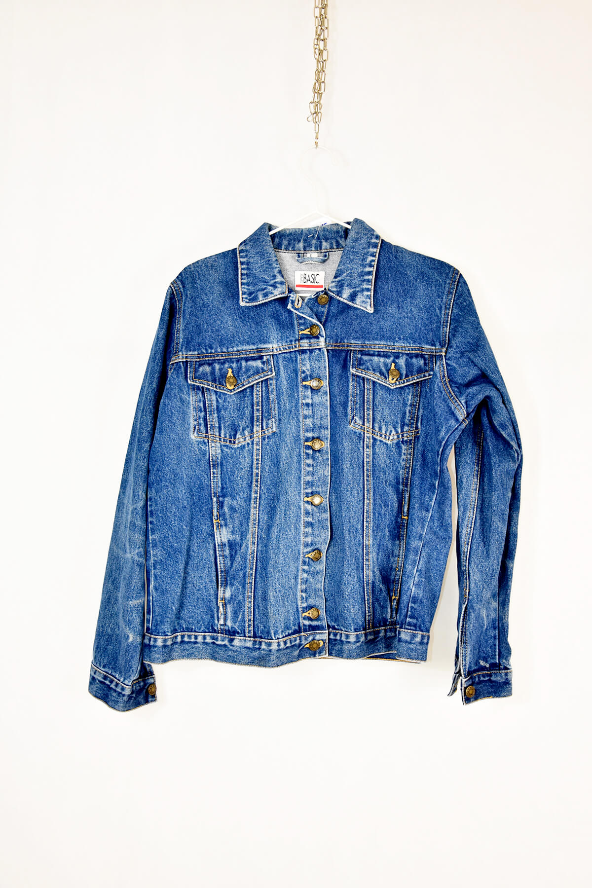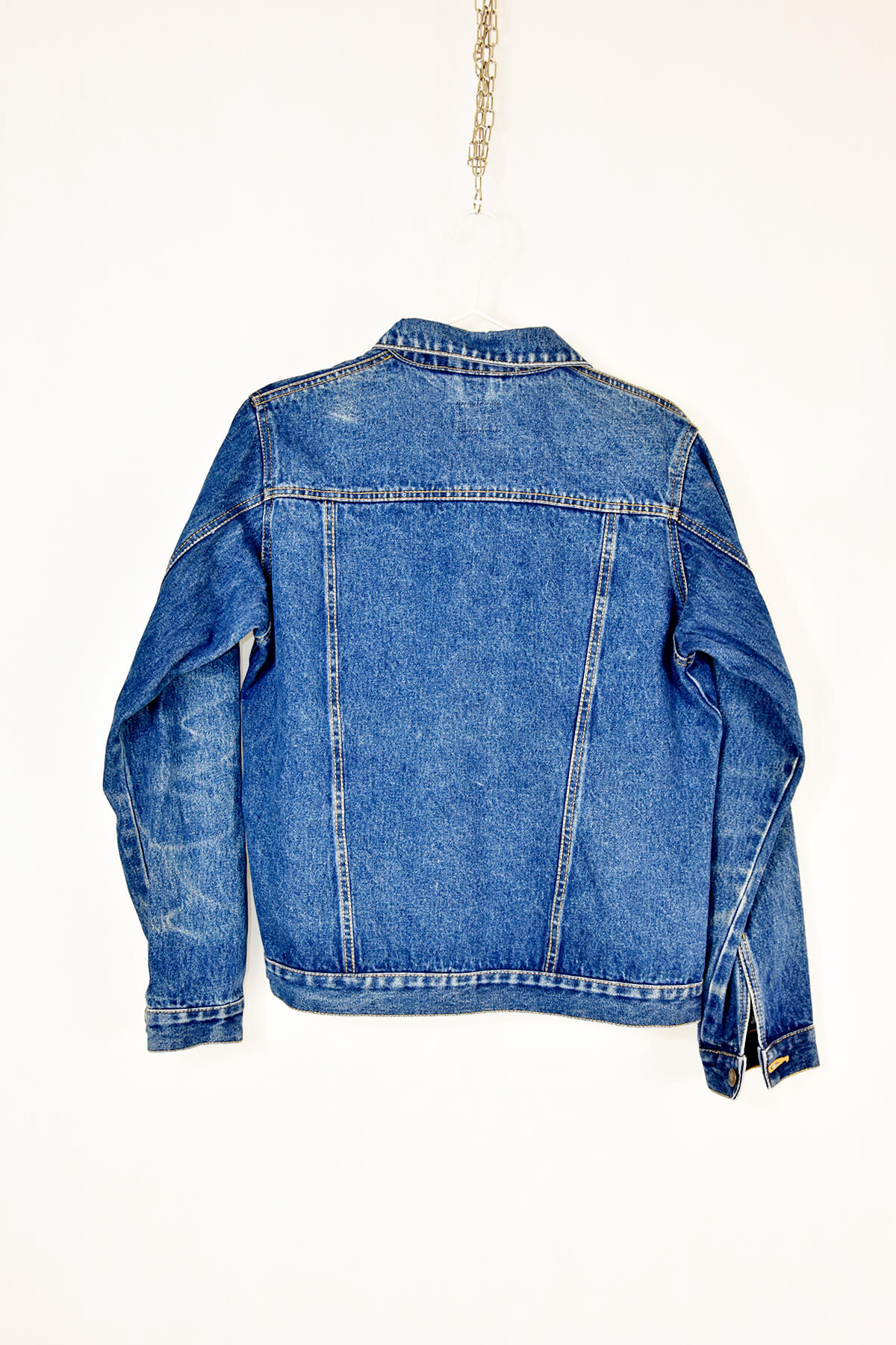 Classic blue denim jacket in size L, crafted from premium denim for durability and comfort. Features a timeless design with button-flap chest pockets, side pockets, and adjustable cuffs. Its versatile style complements any casual outfit, making it a wardrobe staple.