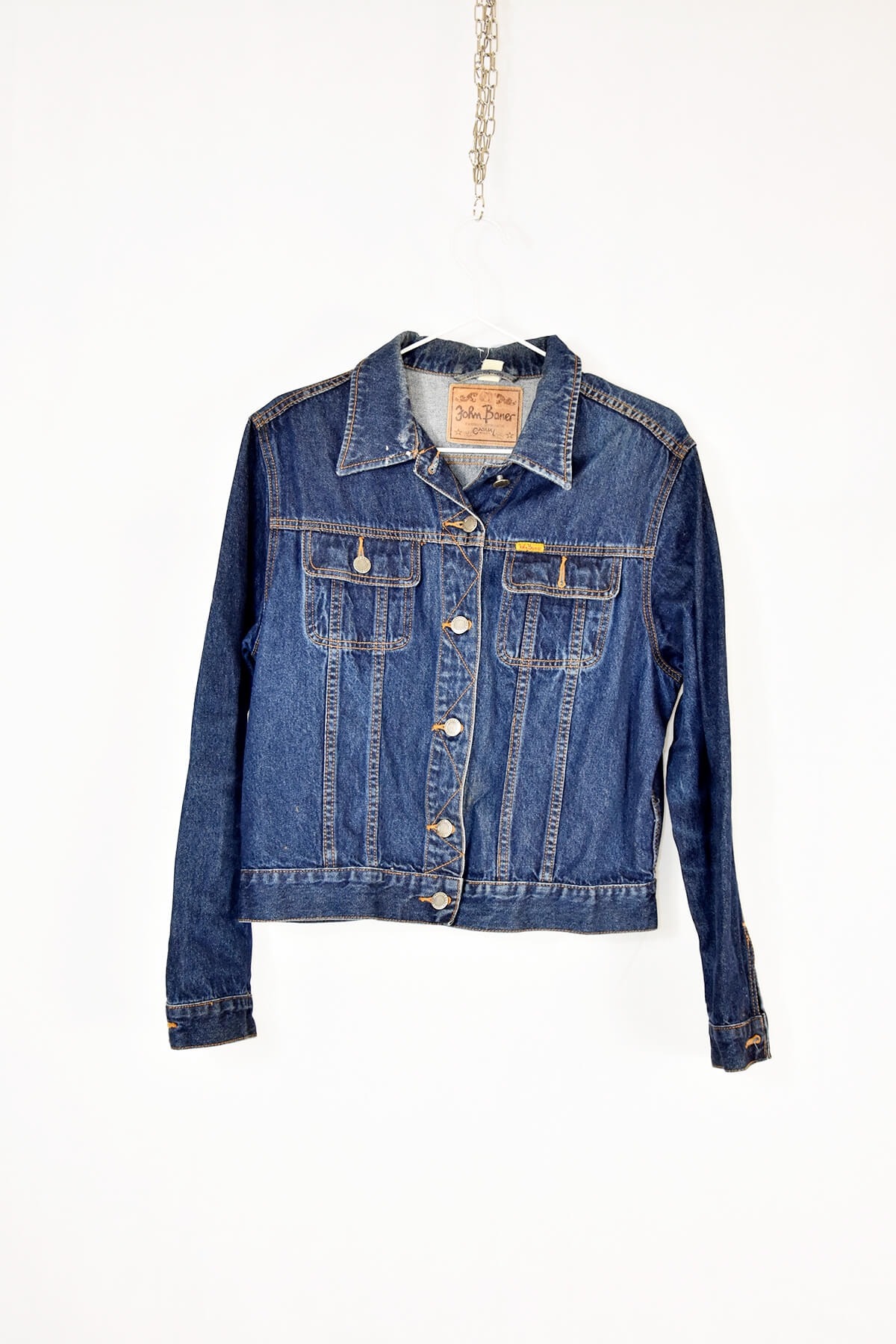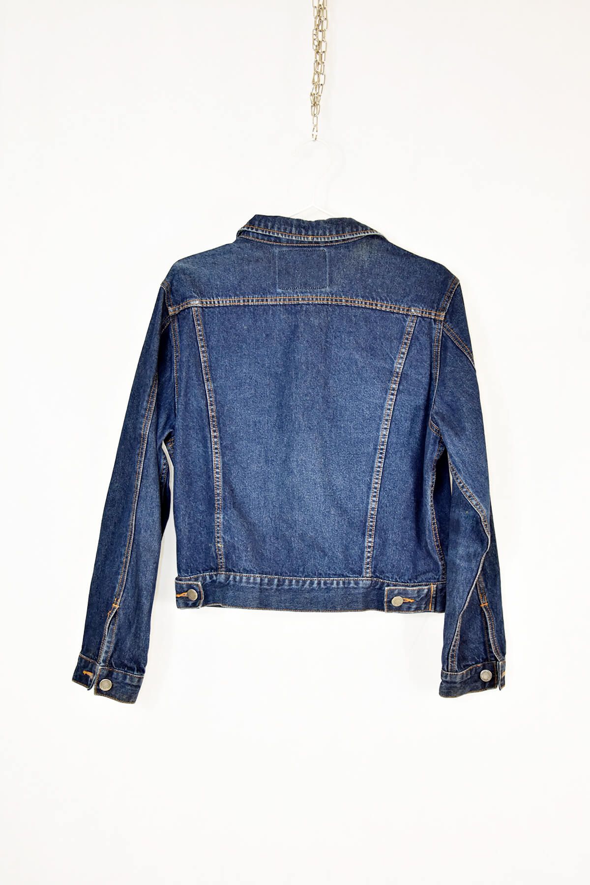 Classic blue denim jacket in size M, crafted from premium denim for durability and comfort. Features a timeless design with button-flap chest pockets, side pockets, and adjustable cuffs. Its versatile style complements any casual outfit, making it a wardrobe staple.
