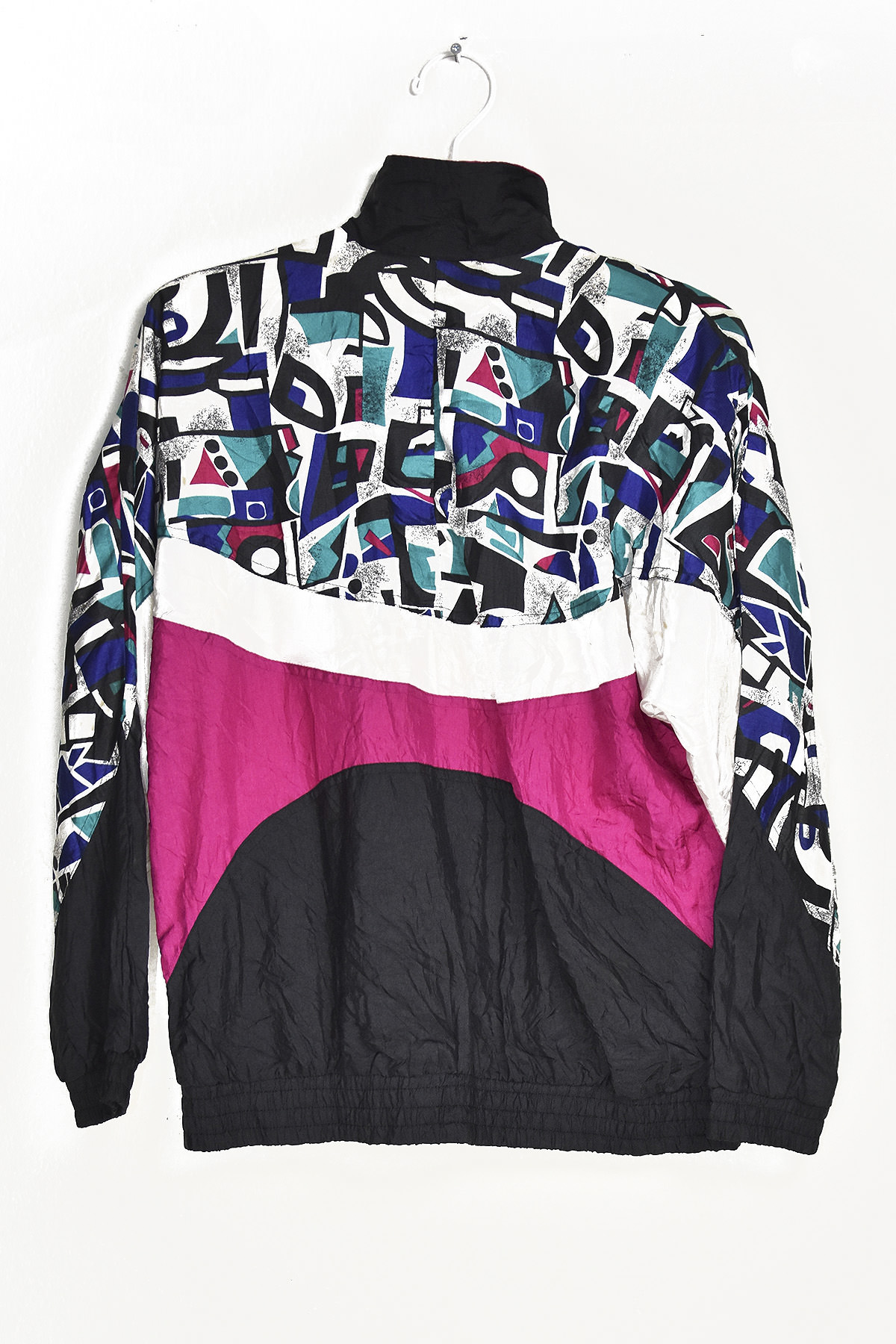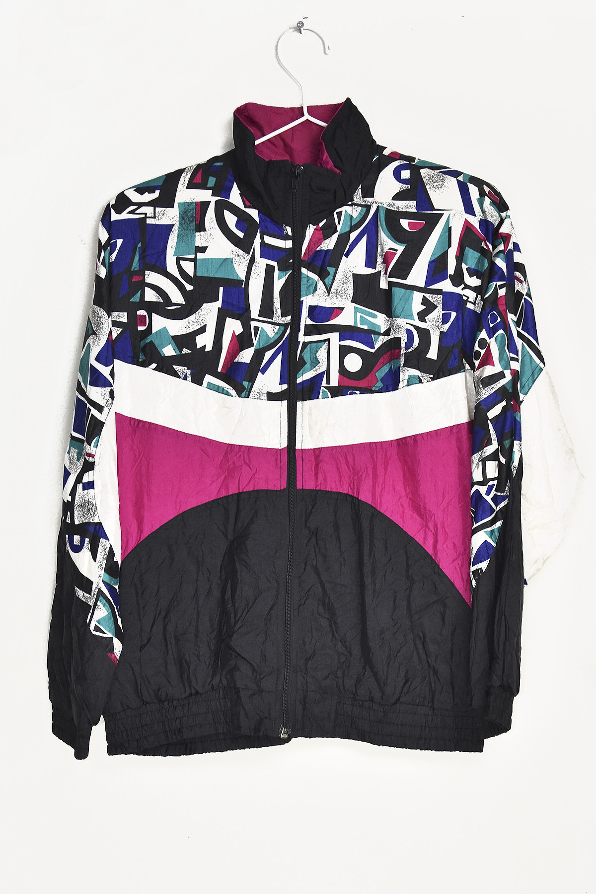 Embrace the vibrant spirit of the 80s with this eye-catching abstract jacket. Its bold black and pink shapes create a captivating visual, while the lightweight fabric ensures comfort on warm summer days. Stand out from the crowd with this unique and stylish piece that embodies the essence of the era.