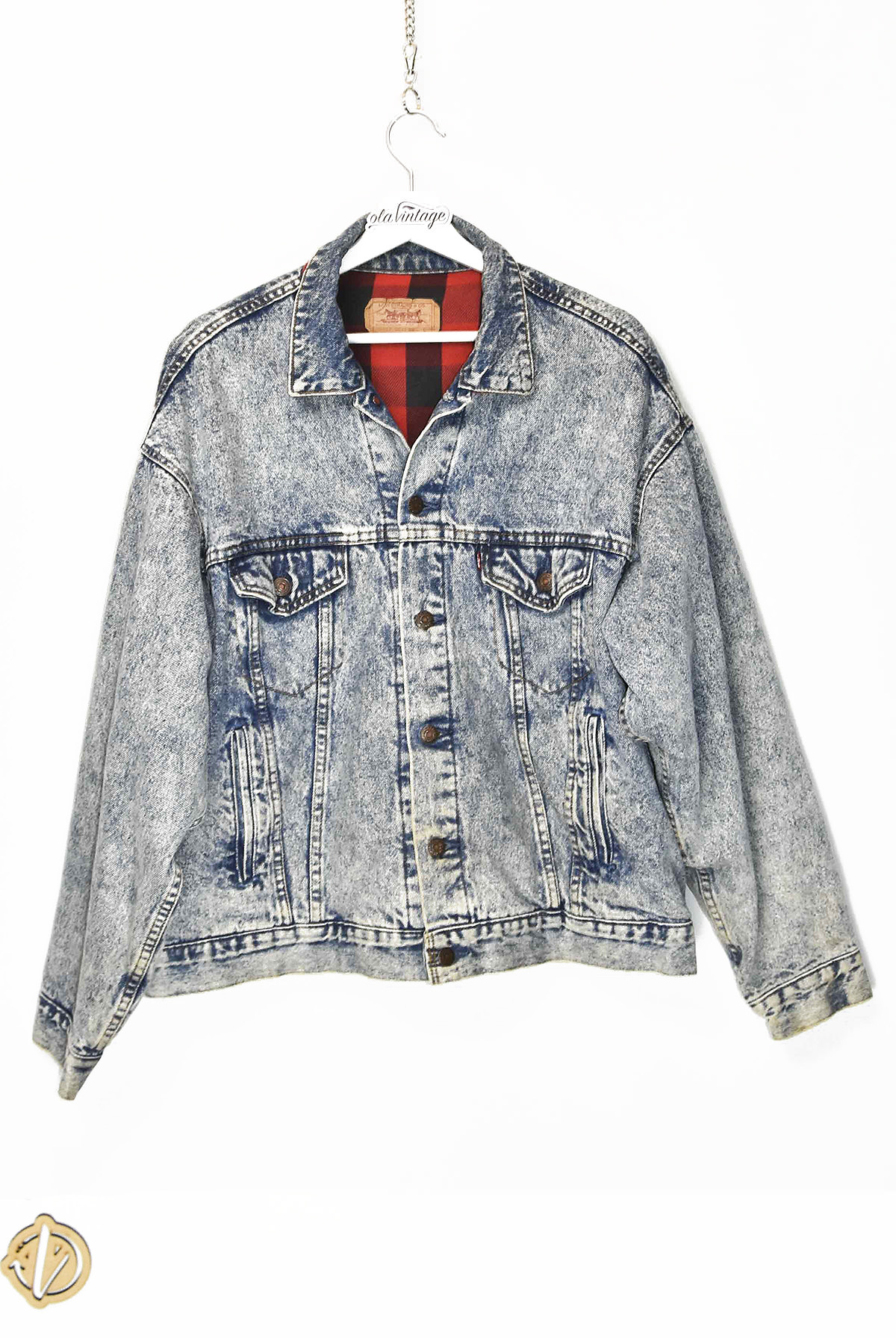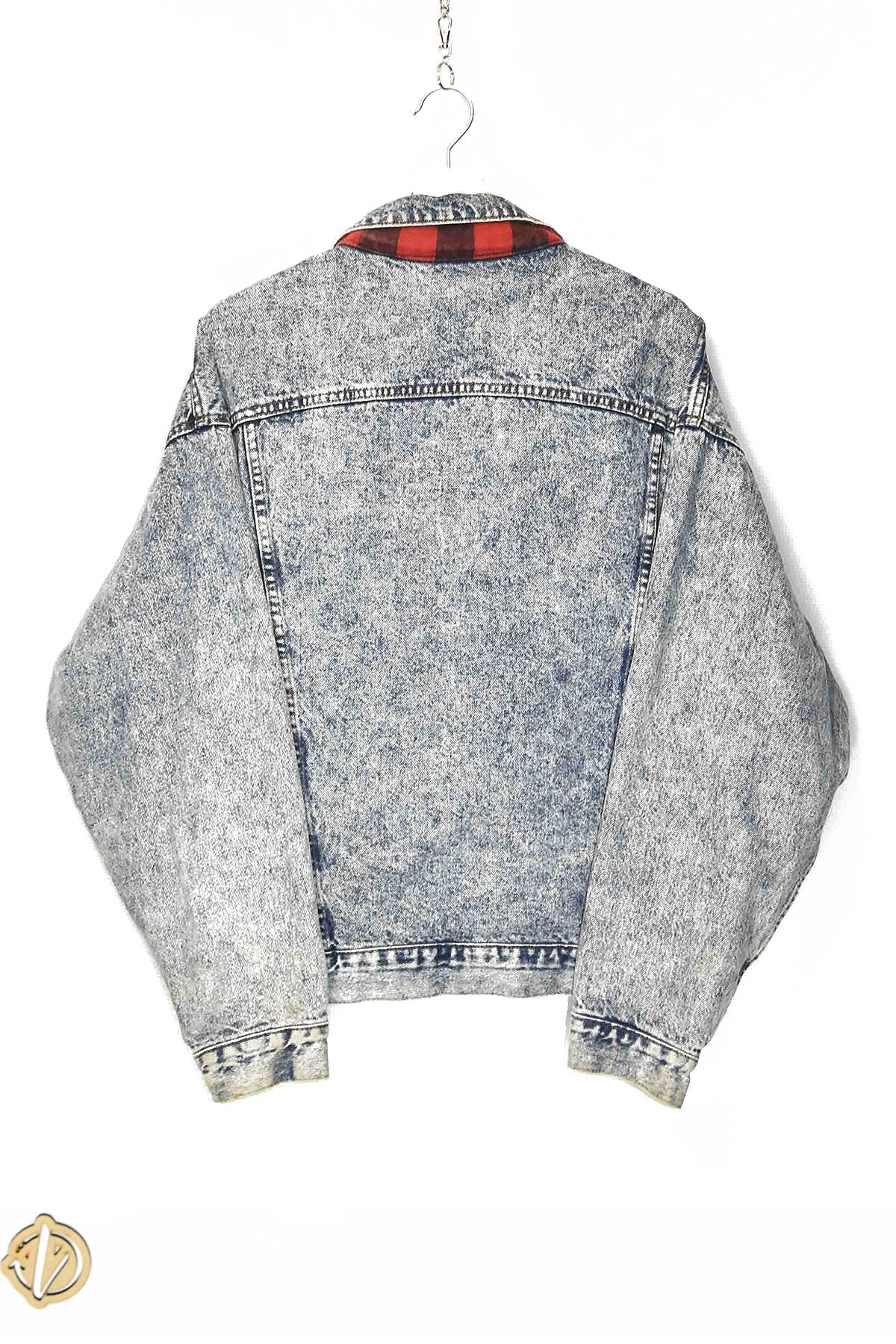 Distinctive denim jacket in light blue with distressed detailing and a vibrant checkered red interior. Its unique design and contrasting colors make it a standout piece, perfect for adding a touch of edgy style to any outfit.