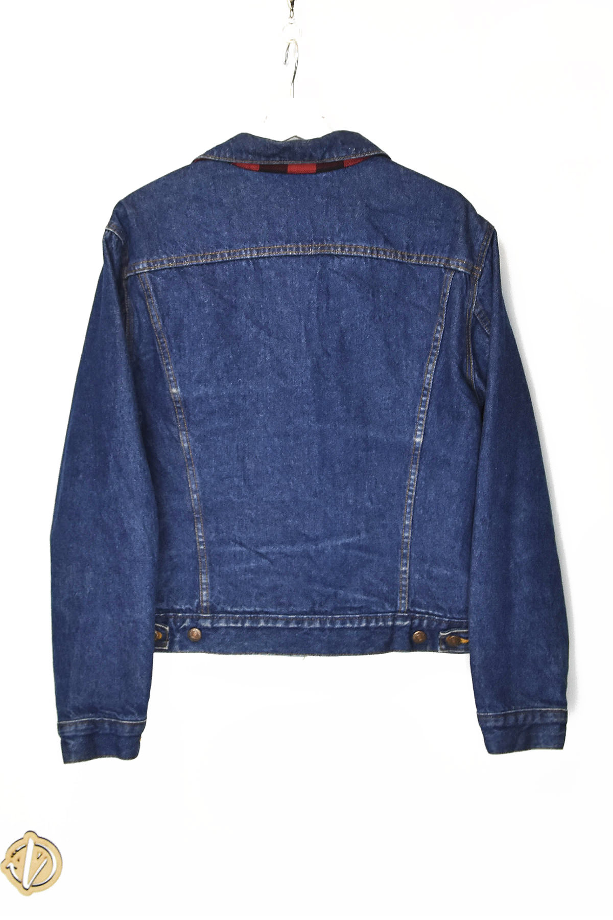 Denim jacket in intense blue with a checkered red interior. Size 42. Features include: