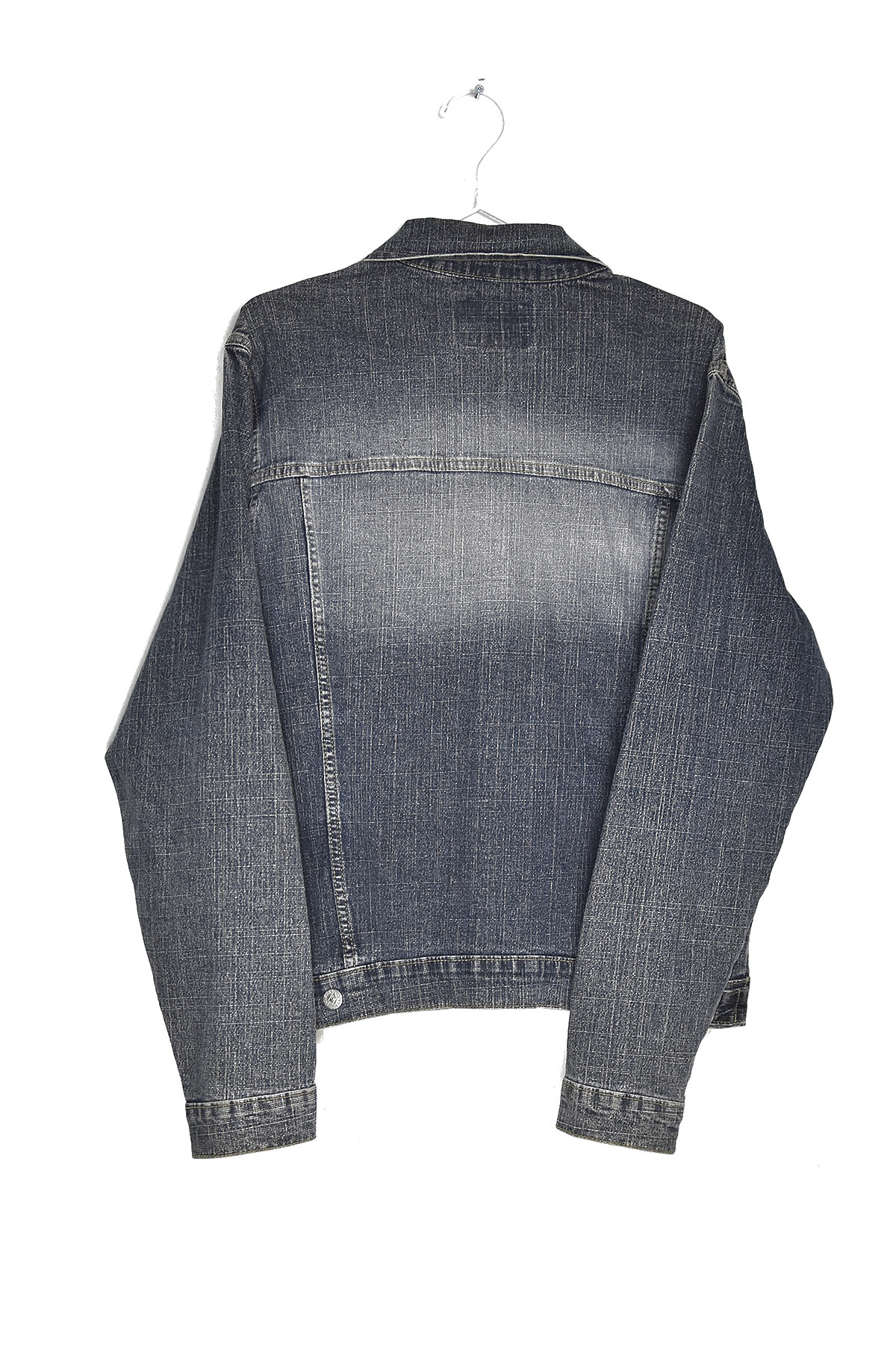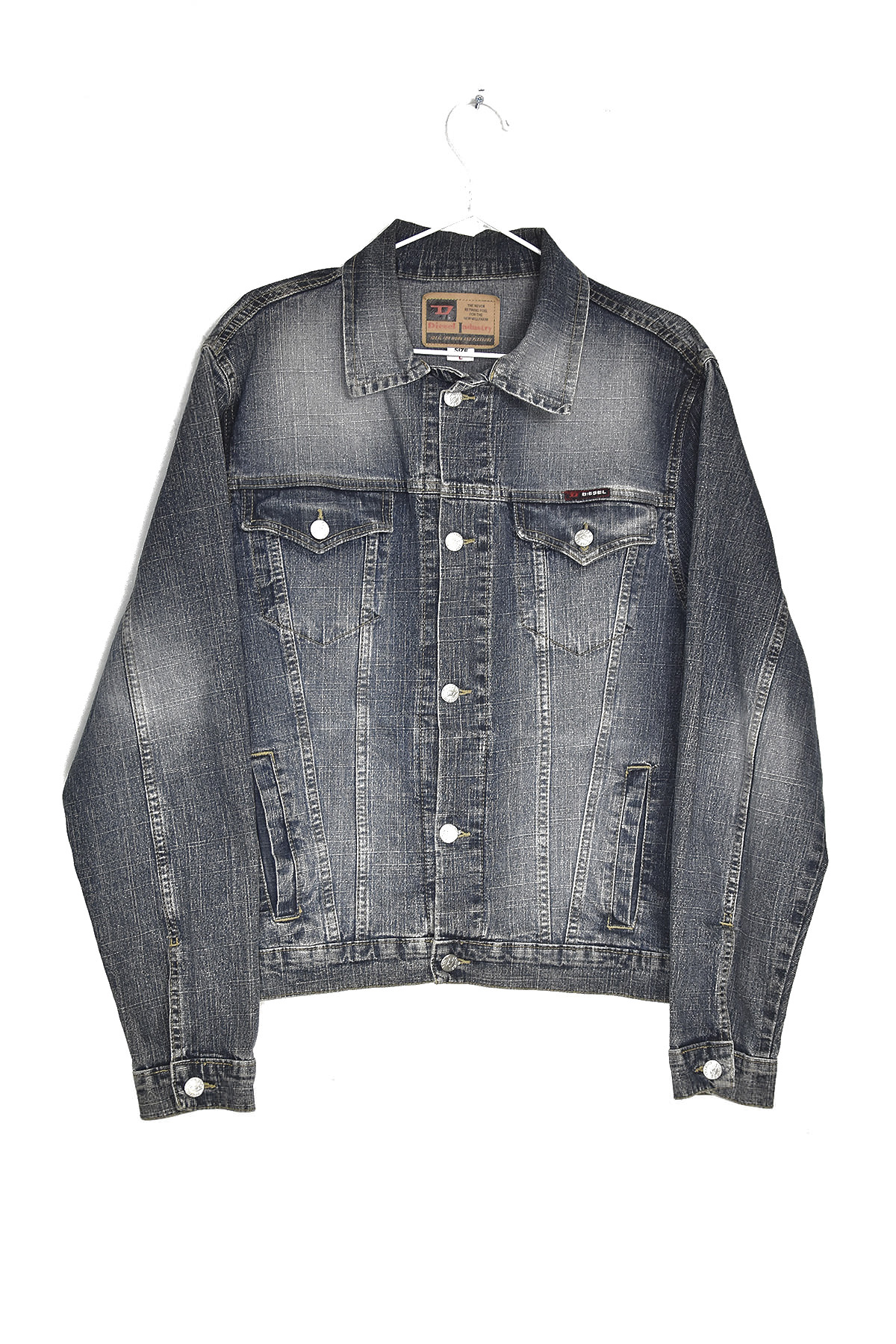 Diesel’s charcoal distressed denim jacket in size L exudes rugged style with its faded wash and distressed details. Crafted from durable denim, it features a classic trucker silhouette with buttoned chest pockets, side pockets, and a button-up front. Its distressed finish adds a touch of vintage charm, while the charcoal hue provides a versatile and edgy look.
