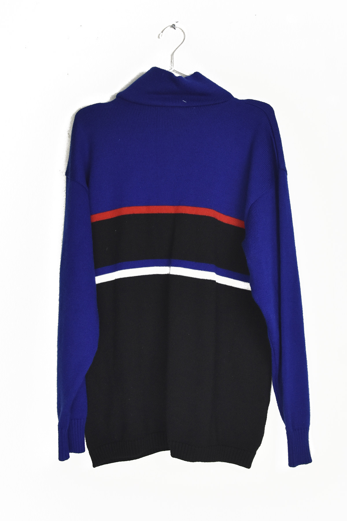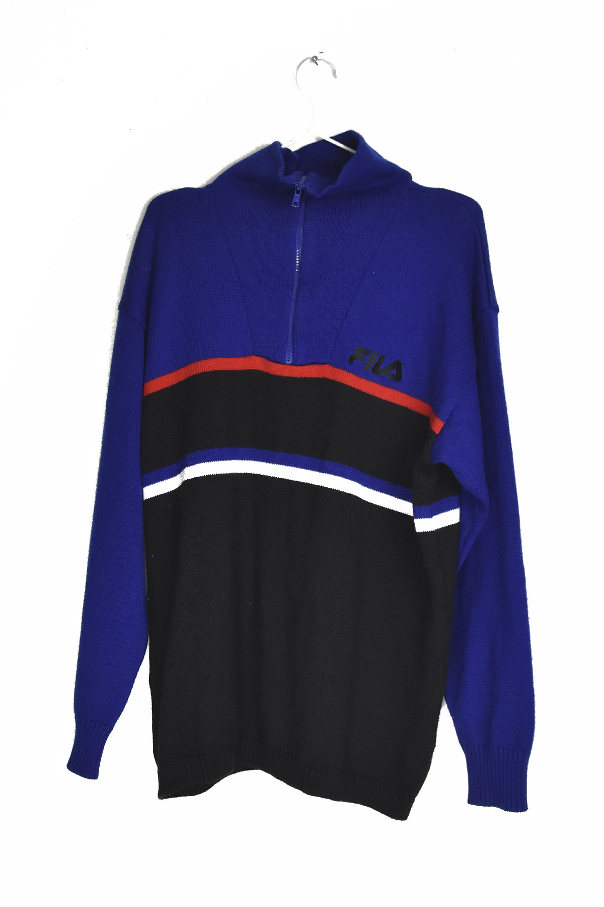 Fila blue and black zipped knitted pullover in XXL size offers a stylish and comfortable layering option. Its soft knitted fabric provides warmth and breathability, while the zippered front allows for easy on and off. The contrasting blue and black color scheme adds a touch of sporty flair, making it suitable for both casual and athletic wear.