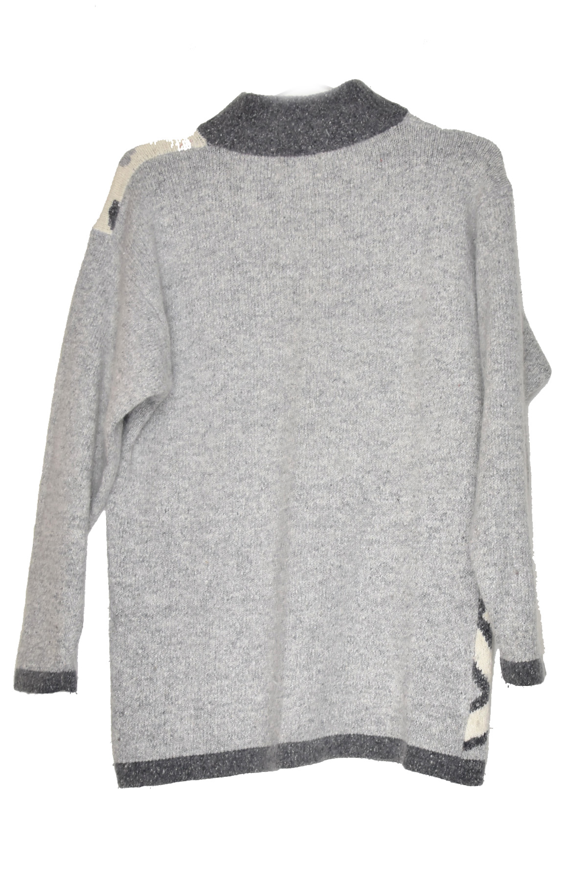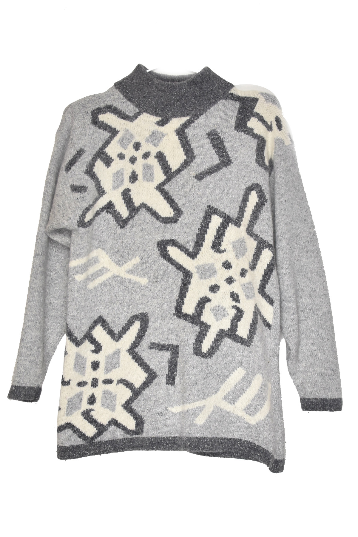Indulge in the cozy embrace of this grey knitted pullover, adorned with captivating white abstract shapes. Its intricate design adds a touch of artistic flair to your wardrobe, while the soft and warm fabric ensures unparalleled comfort. Perfect for layering or wearing alone, this pullover is a versatile addition to any winter ensemble.