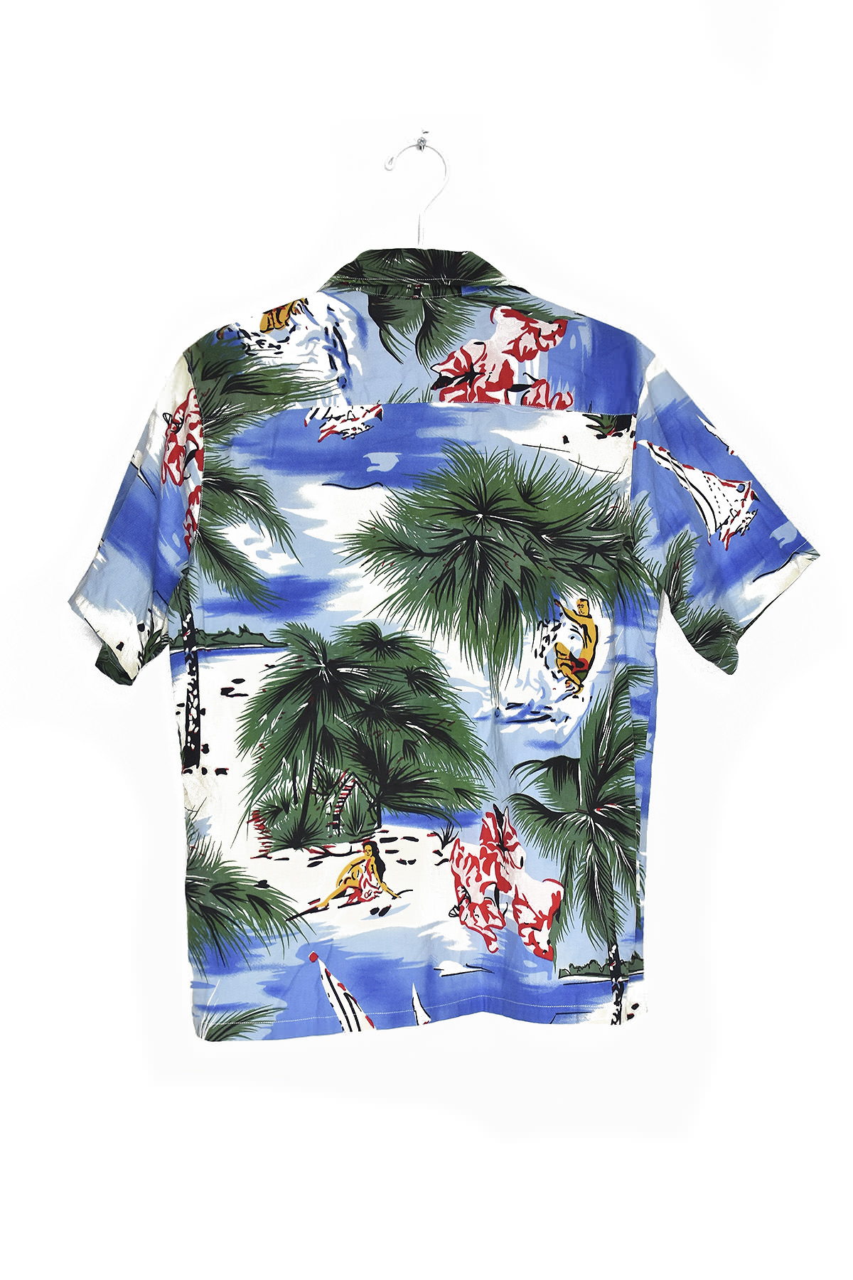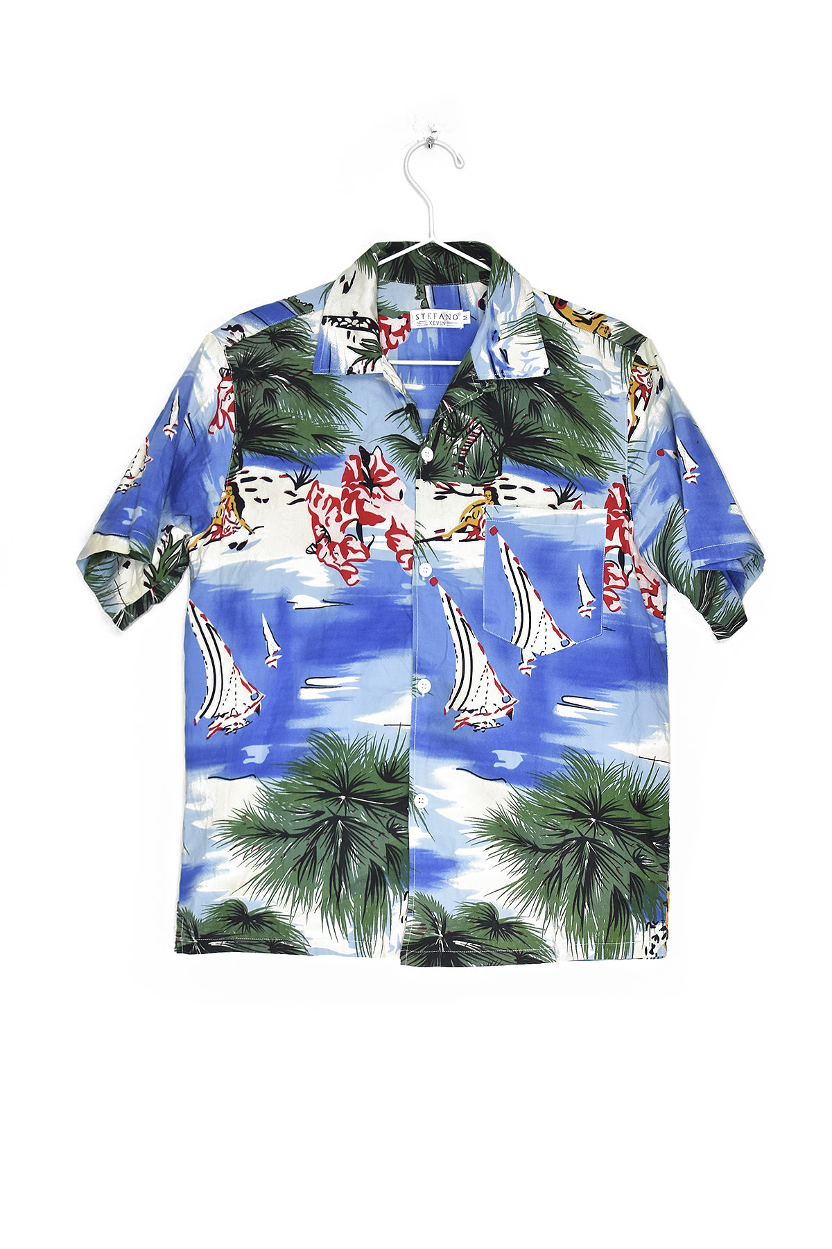 Vintage-inspired shirt featuring a vibrant print of Hawaiian palms and a sailboat, capturing the essence of tropical paradise. Made from soft, breathable fabric for all-day comfort. Perfect for casual outings, beach days, or adding a touch of island flair to any wardrobe.