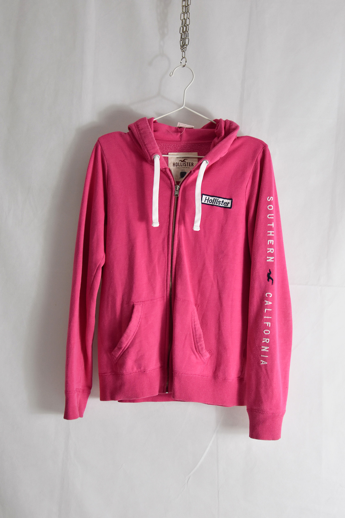 Hollister’s pink zipped hooded sweatshirt in size L offers a stylish and comfortable layering piece. Its soft and cozy fabric provides warmth, while the vibrant pink hue adds a pop of color to any outfit. The full-zip closure allows for easy on and off, and the adjustable hood provides extra protection from the elements. The spacious kangaroo pocket offers convenient storage for essentials.