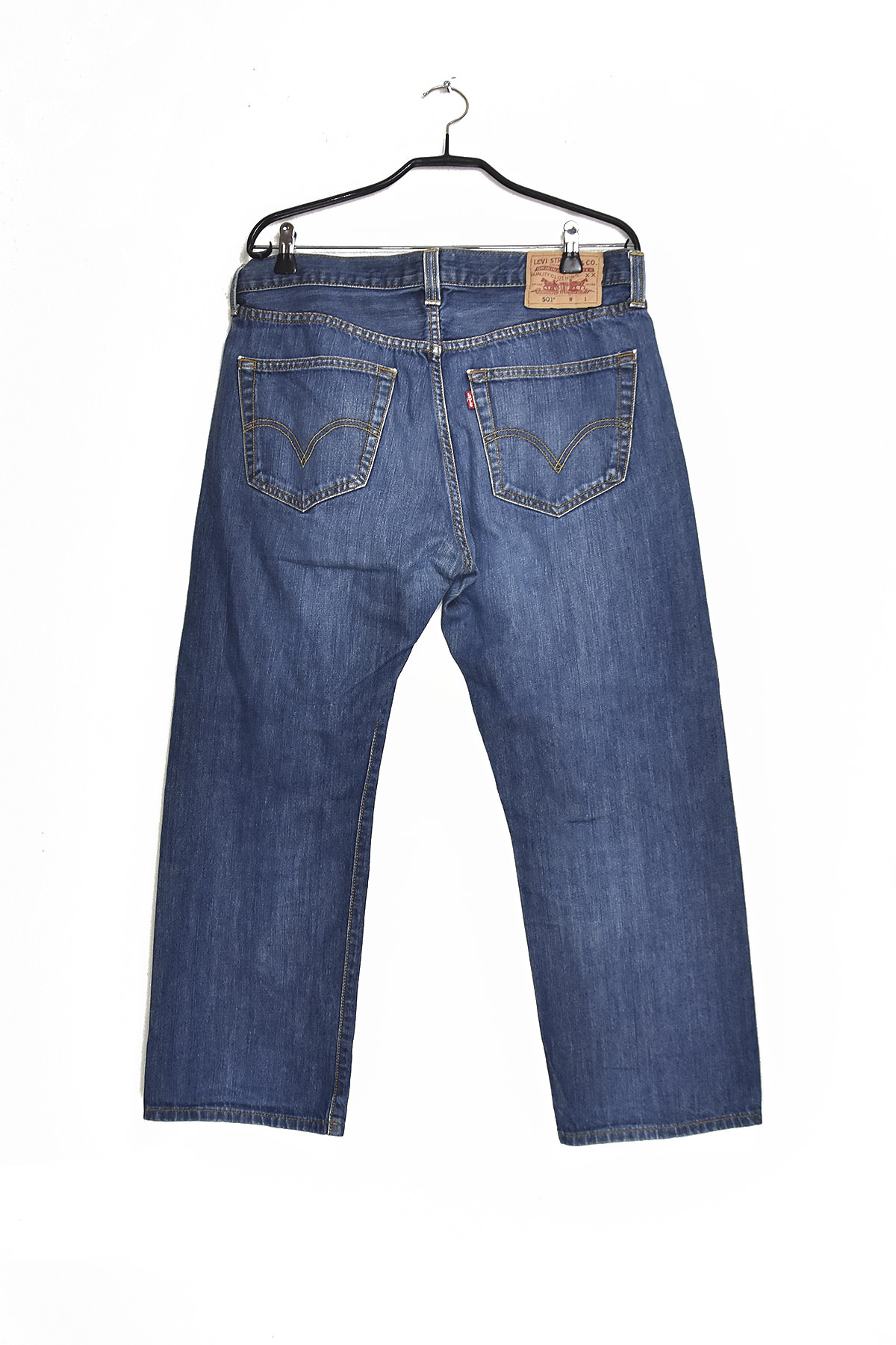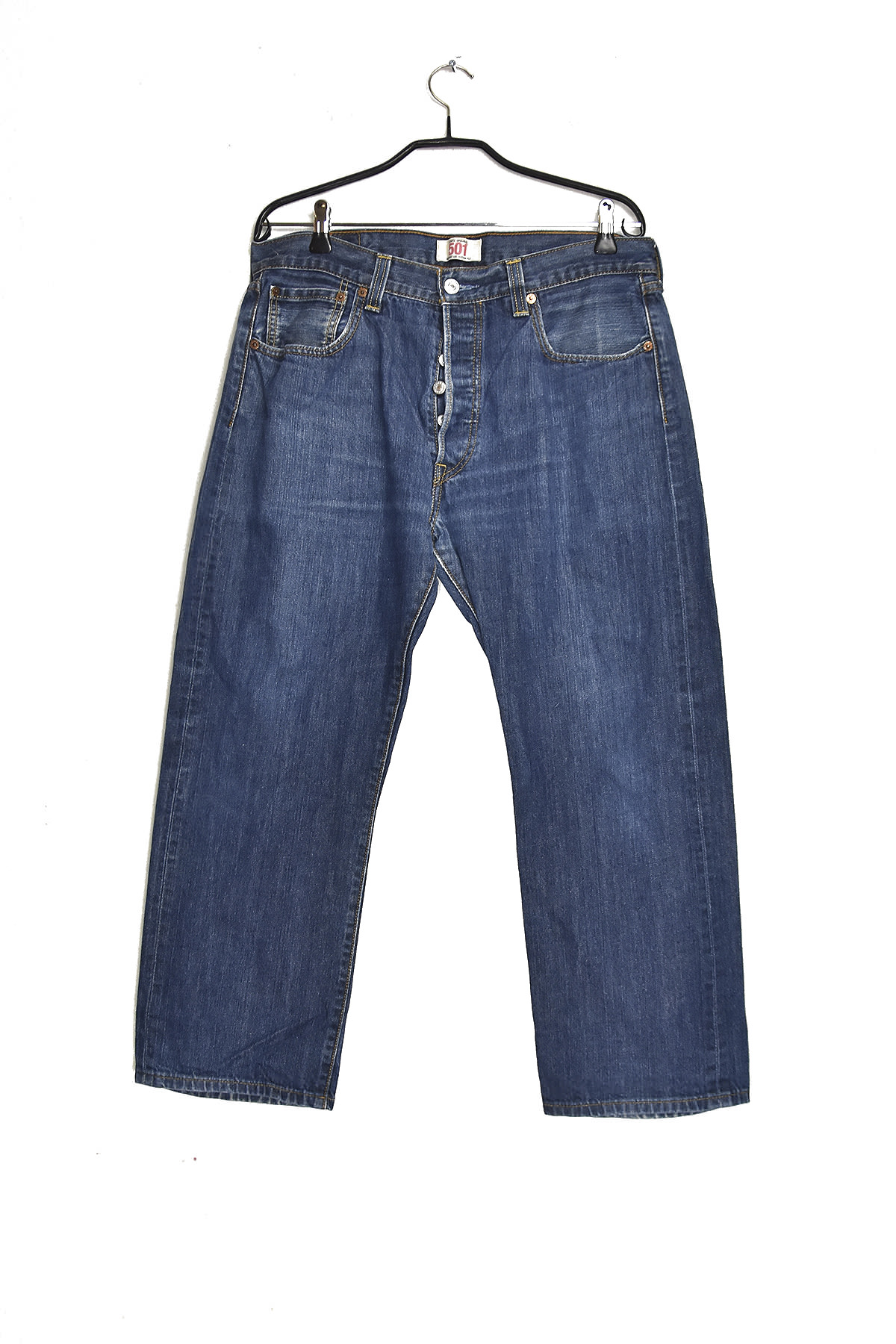 Levi’s 501 loose short blue jeans in size 34/30 offer a relaxed and comfortable fit with a classic straight leg design. Made from durable denim, these jeans feature a button fly, five-pocket styling, and signature arcuate stitching for a timeless look. The loose fit provides ample room for movement, while the short length hits just above the ankle for a modern and versatile style.