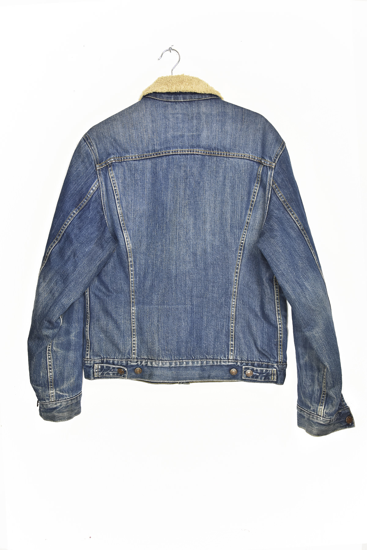 Levi’s distressed blue denim wool jacket in size medium. This jacket is made from a durable wool blend and features a classic denim design with distressed detailing for a vintage look. It has a button-front closure, two chest pockets, and two side pockets for storage. The jacket is designed to provide warmth and comfort while adding a touch of style to any outfit.