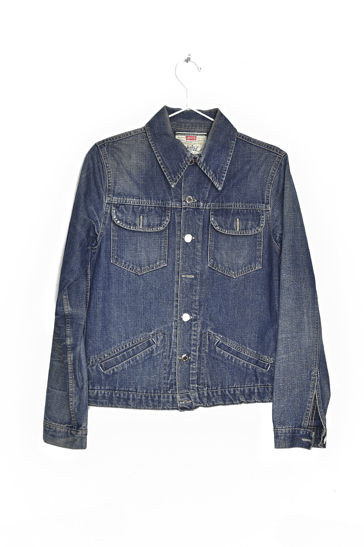 Levi’s distressed light blue jacket in size M is a stylish and versatile piece that combines classic denim style with a modern, edgy twist. Crafted from premium denim, this jacket features a distressed finish that gives it a unique, lived-in look. The light blue wash adds a touch of freshness and makes it easy to pair with a variety of outfits. With its timeless design and durable construction, this Levi’s jacket is a must-have for any fashion-forward wardrobe.