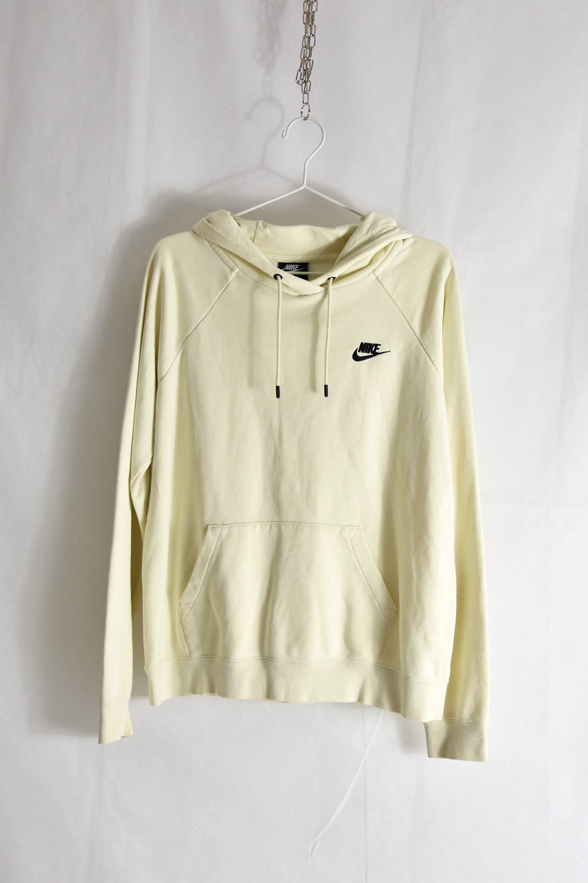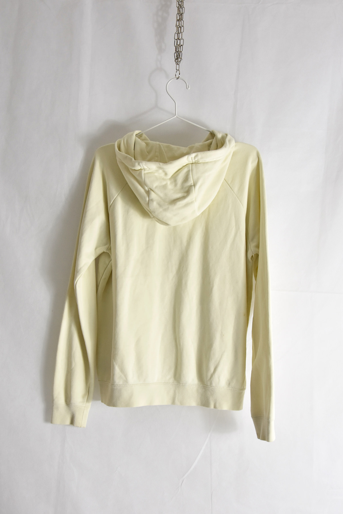 Nike’s light yellow hooded sweatshirt in size medium offers a vibrant and comfortable layering option. Crafted from soft and breathable fabric, it features an adjustable hood for customizable coverage, a kangaroo pocket for warmth and storage, and ribbed cuffs and hem for a secure fit. Its eye-catching color adds a pop of style to any casual outfit, making it a versatile choice for everyday wear.