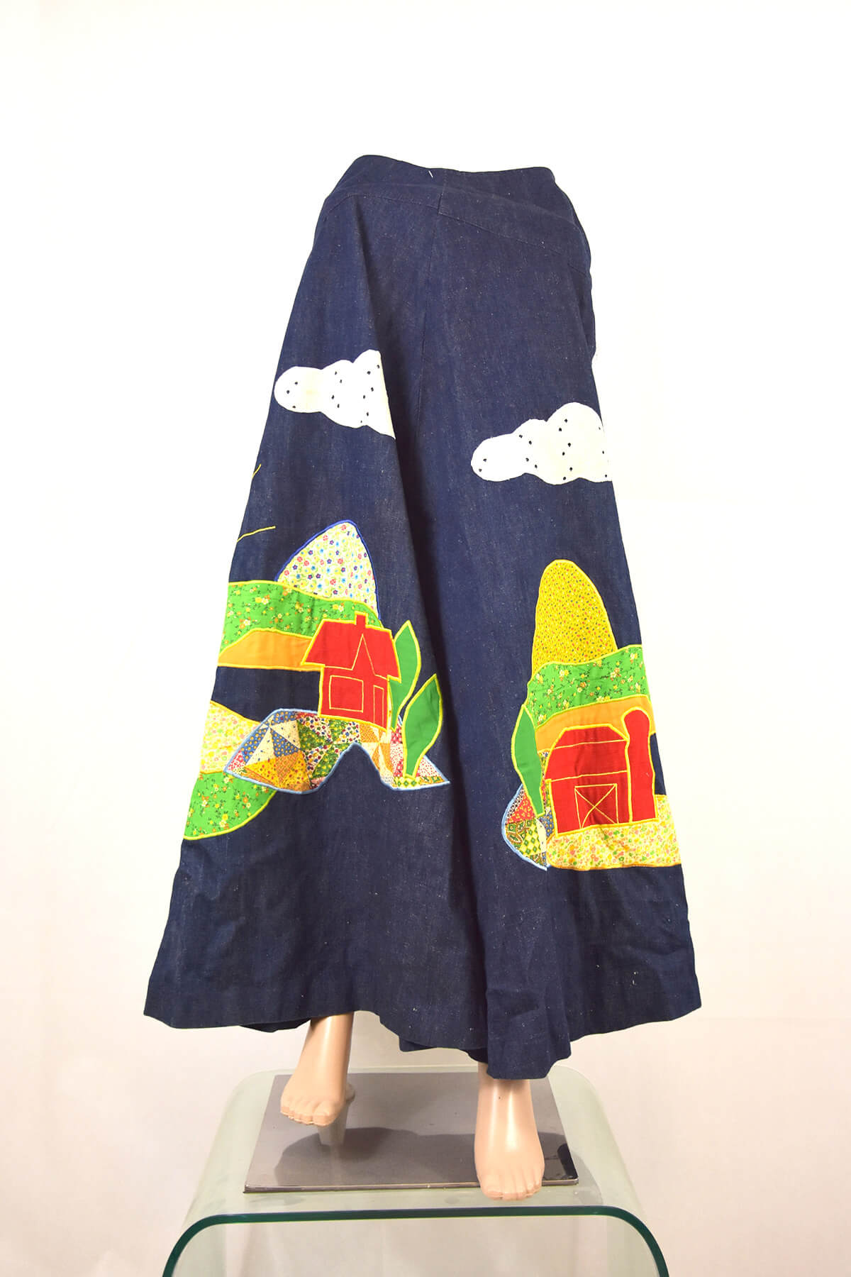 Embrace the retro charm with our captivating blue skirt adorned with a whimsical print of houses and mountains. Its flowy silhouette flatters any figure, while the vibrant hues evoke a sense of nostalgia and adventure. The unique print adds a touch of whimsy to your wardrobe, making it a standout piece for any occasion.