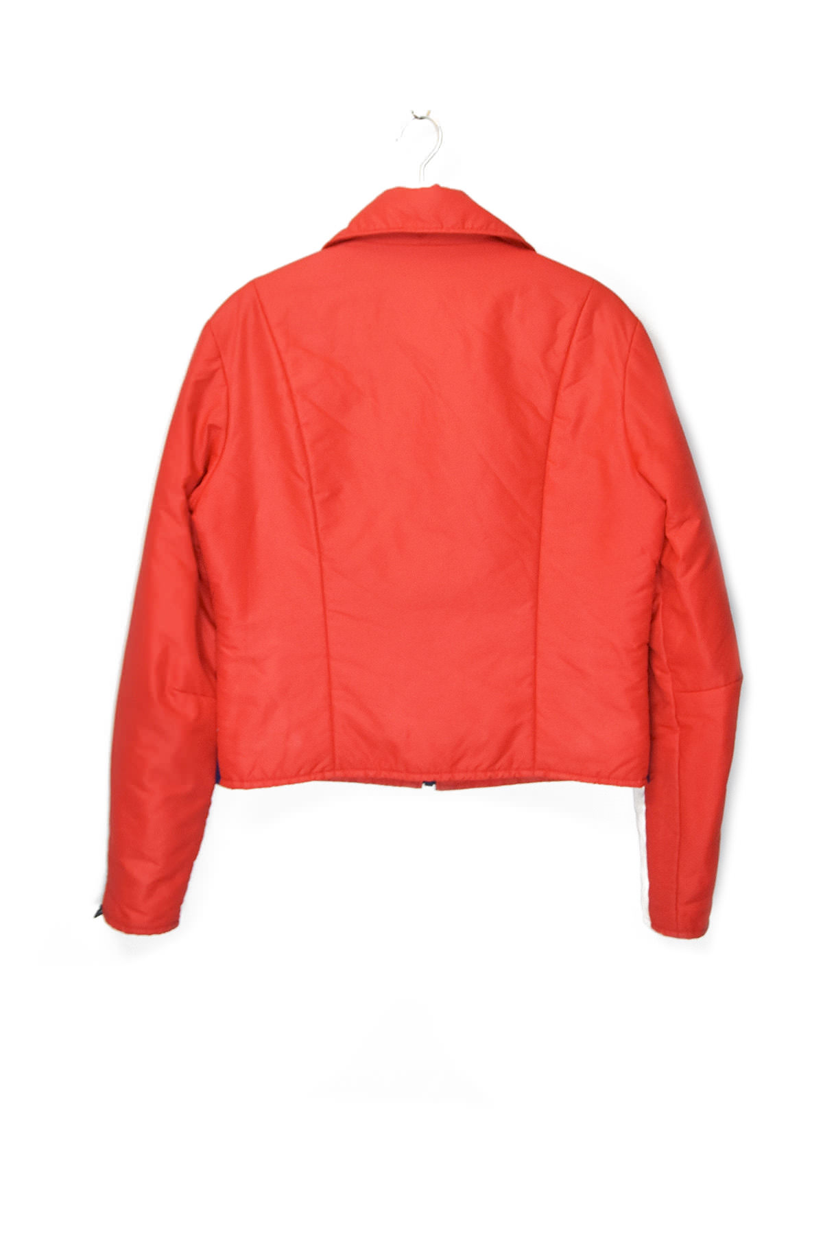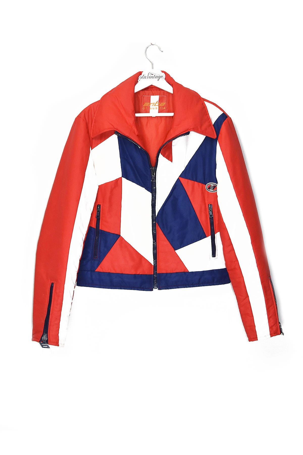 Retro-inspired winter jacket in bold red, blue, and white geometric shapes. Features a T48 size, providing ample coverage and warmth. Its unique design evokes a nostalgic charm, while the durable construction ensures protection against harsh winter elements.