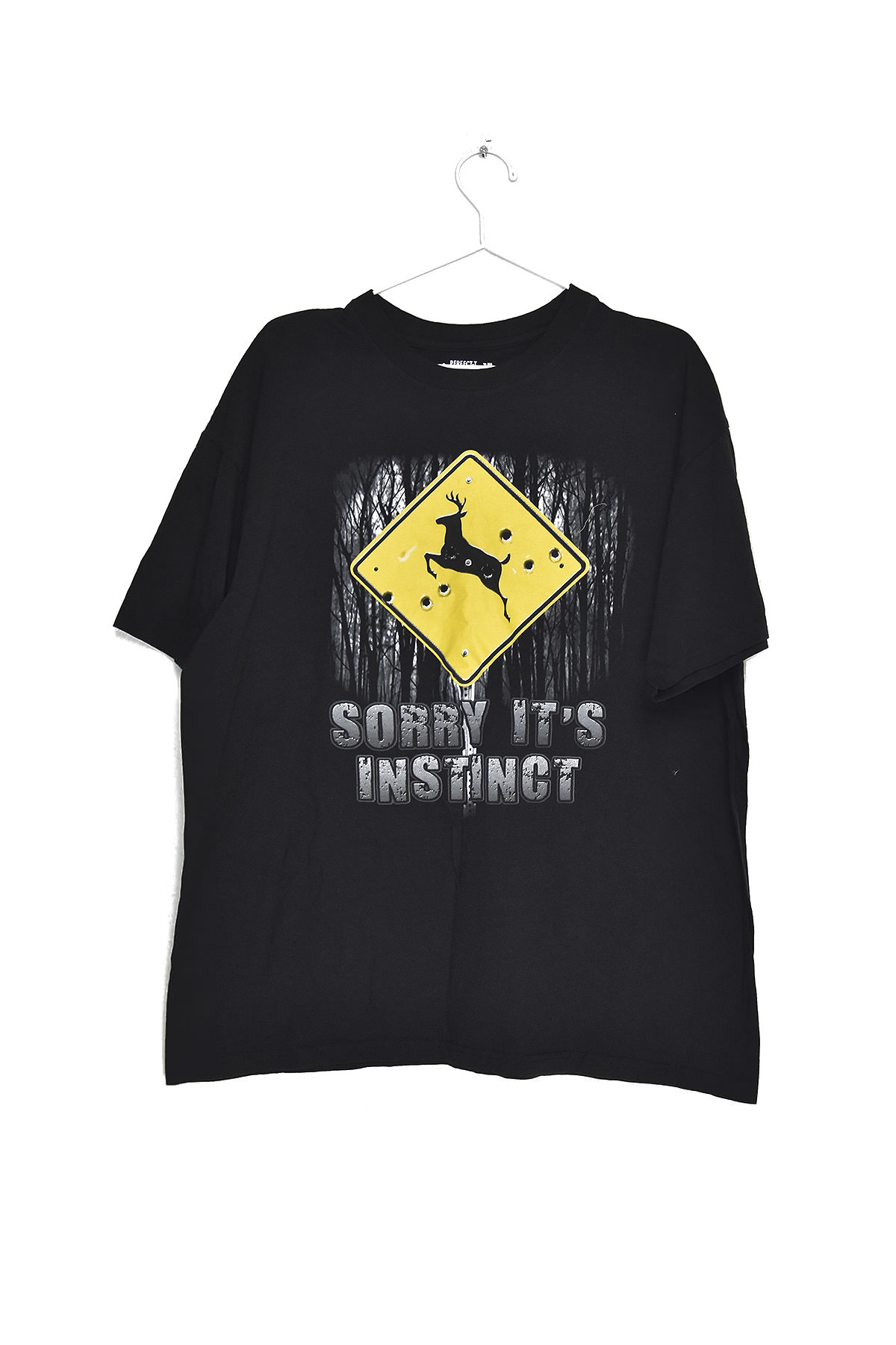 Sorry It’s Instinct deer design print black t-shirt in XL features a striking deer graphic, crafted from premium cotton for exceptional comfort and durability. Its unique design and high-quality construction make it a standout piece for nature enthusiasts and fashion-forward individuals.