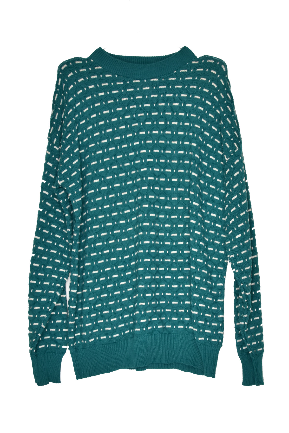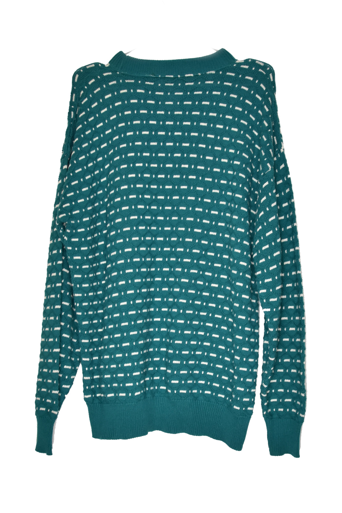 Teal pullover with mini white horizontal lines. Size M. Soft and comfortable knit fabric. Stylish and versatile design. Perfect for layering or wearing on its own.