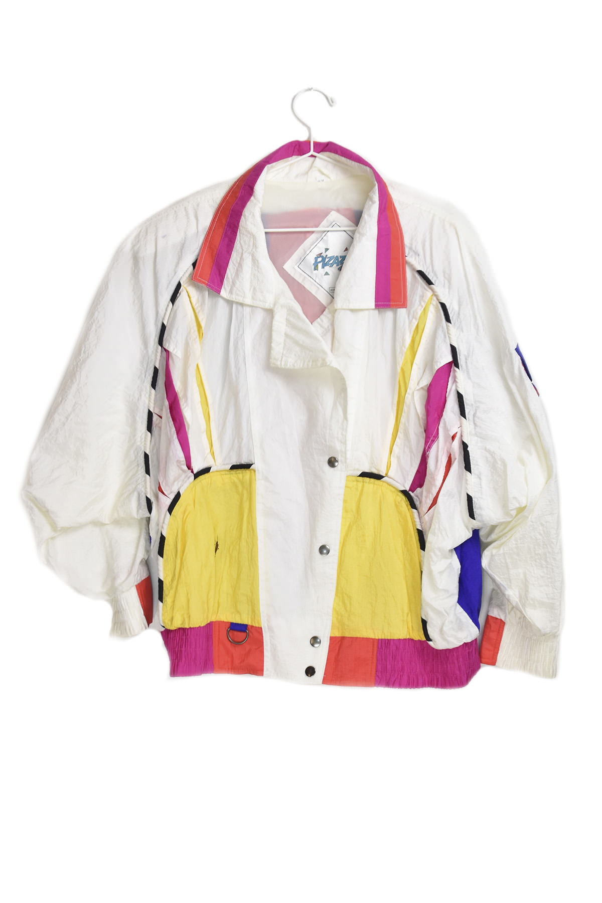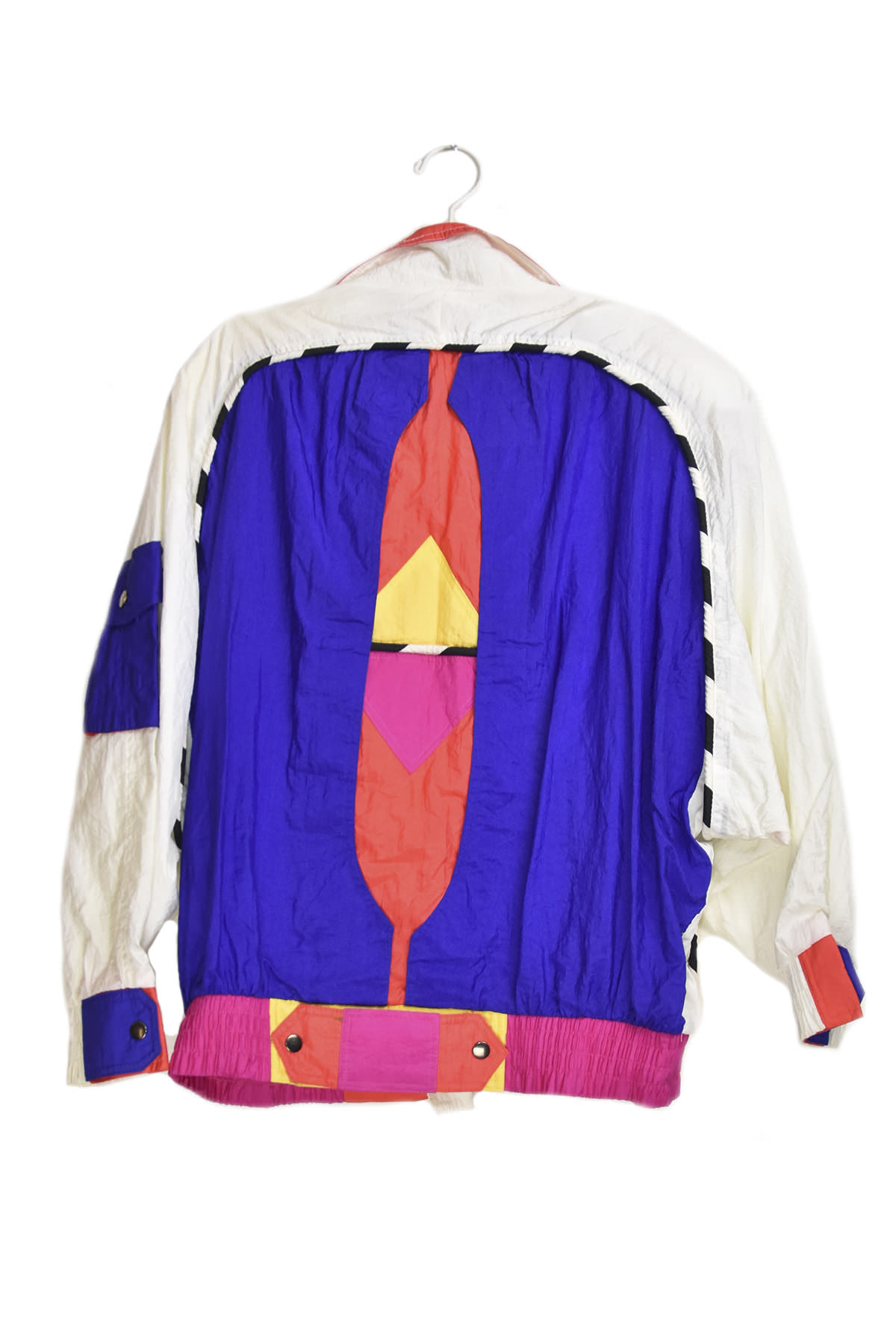 Step back into the vibrant 80s with this eye-catching vintage jacket. Its bold geometric shapes in white, yellow, and pink create a playful and nostalgic look. The lightweight fabric ensures comfort on warm summer days, while the unique design makes it a standout piece. Embrace the retro charm and add a touch of vintage flair to your wardrobe with this unforgettable jacket.