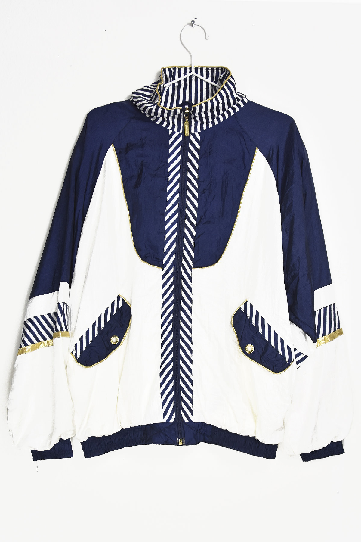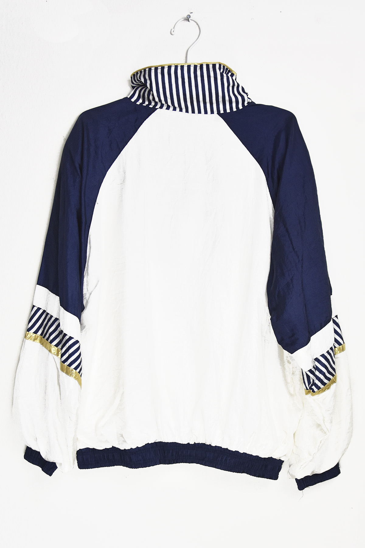 Vintage-inspired summer jacket in white and blue with a striking line design. Its lightweight and breathable fabric ensures comfort during warm weather, while its unique pattern adds a touch of retro charm. The oversized XL size provides a relaxed and comfortable fit, making it perfect for casual outings or layering over lighter garments.